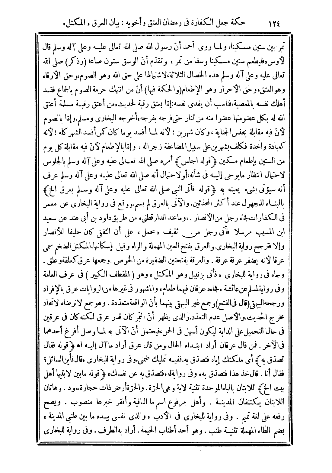 (قوله فأتى النبى صلى الله تعالى عليه وعلى آله وسلم بعرق الخ) بالبناء للمجهول عند أكثر المحدّثين. والآتى بالعرق لم يسم. ووقع فى رواية البخارى عن معمر فى الكفارات فجاء رجل من الأنصار. "وما عند الدارقطنى" من طريق داود بن أبى هند عن سعيد ابن المسيب مرسلا فأتى رجل من ثقيف "يحمل" على أن الثقفى كان حليفا للأنصار وإلا فترجح رواية البخارى. والعرق بفتح العين المهملة والراء وقيل بإسكانها، المكتل الضخم سمى عرقا لأنه يضفر عرقة عرقة. والعرقة بفتحتين الضفيرة من الخوص وجمعها عرق كعلقة وعلق. وجاء فى رواية للبخارى "فأتى بزنبيل وهو المكتل" وهو (المقطف الكبير) فى عرف العامة وفى رواية لمسلم عن عائشة "فجاءه عرقان فيهما طعام" والمشهور فى غيرها من الروايات عرق بالإفراد ورجحه البيهقى (قال فى الفتح) وجمع غير البيهقى بينهما بأنّ الواقعة متعدّدة. وهو جمع لا نرضاه لاتحاد مخرج الحديث. والأصل عدم التعدّد. والذى يظهر أنّ التمر كان قدر عرق لكنه كان فى عرقين فى حال التحميل على الدابة ليكون أسهل فى الحمل، فيحتمل أنّ الآتى به لما وصل أفرغ أحدهما فى الآخر. فمن قال عرقان أراد ابتداء الحال. ومن قال عرق أراد ما آل إليه اهـ