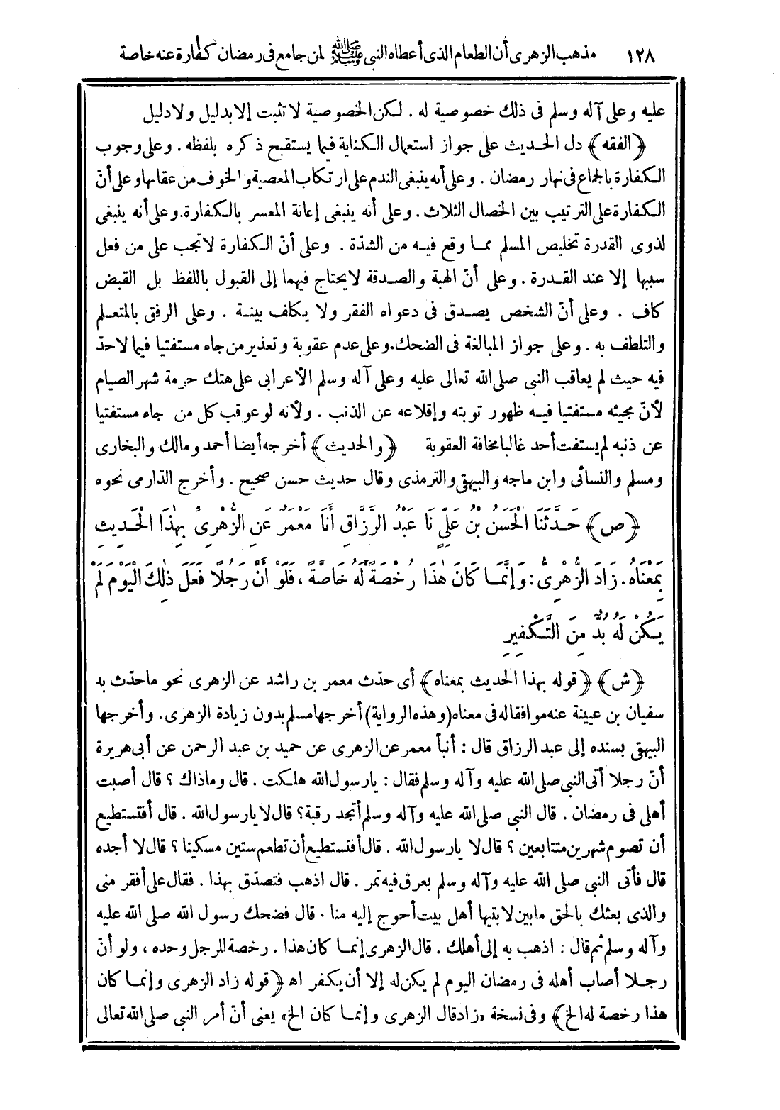 (ص) حَدَّثَنَا الْحَسَنُ بْنُ عَلِىٍّ نَا عَبْدُ الرَّزَّاقِ أَنَا مَعْمَرٌ عَنِ الزُّهْرِىِّ بِهَذَا الْحَدِيثِ بِمَعْنَاهُ. زَادَ الزُّهْرِىُّ: وَإِنَّمَا كَانَ هَذَا رُخْصَةً لَهُ خَاصَّةً, فَلَوْ أَنَّ رَجُلاً فَعَلَ ذَلِكَ الْيَوْمَ لَمْ يَكُنْ لَهُ بُدٌّ مِنَ التَّكْفِيرِ.