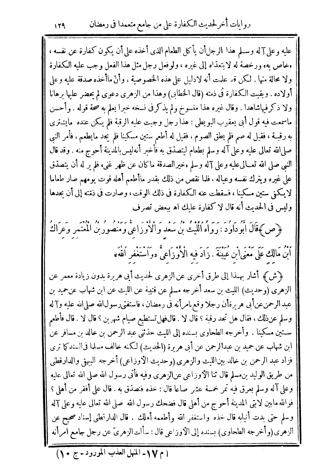 (ش) أشار بهذا إلى طرق أخرى عن الزهرى لحديث أبى هريرة بدون زيادة معمر عن الزهرى (وحديث) الليث بن سعد أخرجه مسلم عن قتيبة عن الليث عن ابن شهاب عن حميد بن عبد الرحمن عن أبى هريرة أن رجلا وقع بامرأته فى رمضان، فاستفتى رسول الله صلى الله عليه وآله وسلم عن ذلك، فقال هل تجد رقبة؟ قال لا. قال فهل تستطيع صيام شهرين؟ قال لا. قال فأطعم ستين مسكينا. وأخرجه الطحاوى بسنده إلى الليث حدّثنى عبد الرحمن بن خالد بن مسافر عن ابن شهاب عن حميد بن عبد الرحمن عن أبى هريرة (الحديث) لكنه خالف مسلما فى السند كما ترى فزاد عبد الرحمن بن خالد بين الليث والزهرى (وحديث الأوزاعى) أخرجه البيهقى والدارقطنى من طريق الوليد بن مسلم قال ثنا الأوزاعى عن الزهرى وفيه فأتى رسول الله صلى الله تعالى عليه وعلى آله وسلم بعرق في تمر خمسة عشر صاعا قال: خذه فتصدّق به. قال على أفقر من أهلى؟ فوالله ما بين لابتى المدينة أحوج من أهلى قال فضحك رسول الله صلى الله تعالى عليه وعلى آله وسلم حتى بدت أنيابه قال خذه واستغفر الله وأطعمه أهلك. قال الدارقطنى إسناد صحيح عن الزهرى (وأخرجه الطحاوى) بسنده إلى الأوزاعى قال: سألت الزهرىّ عن رجل جامع امرأته