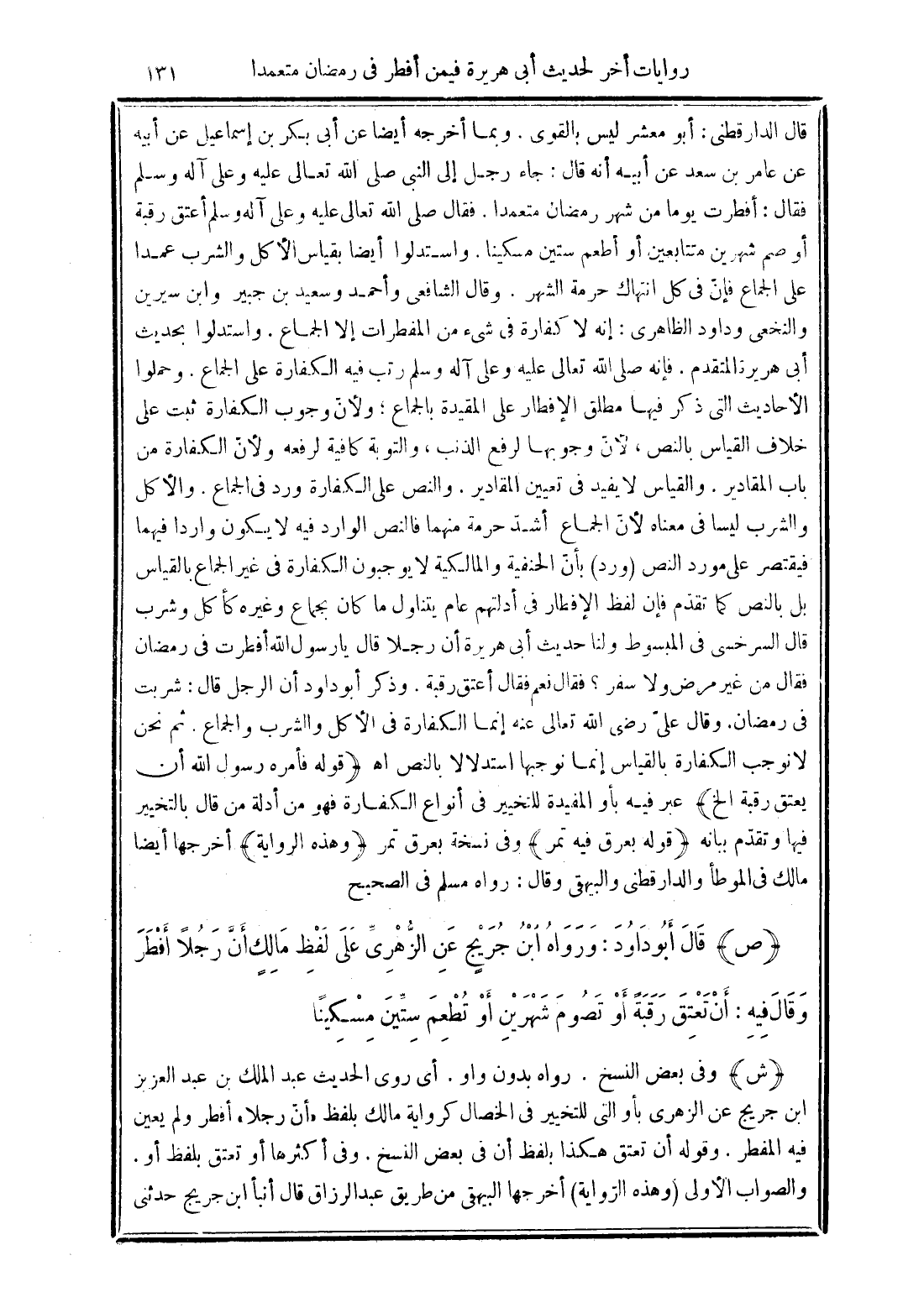 قال الدارقطنى: أبو معشر ليس بالقوى. وبما أخرجه أيضا عن أبى بكر إسماعيل عن أبيه عن عامر بن سعد عن أبيه أنه قال: جاء رجل إلى النبي صلى الله تعالى عليه وعلى آله وسلم فقال: أفطرت يوما من شهر رمضان متعمدا. فقال صلى الله تعالى عليه وعلى آله وسلم أعتق رقبة أو صم شهرين متتابعين أو أطعم ستين مسكينا. واستدلوا أيضًا بقياس الأكل والشرب عمدا على الجماع فإنّ فى كل انتهاك حرمة الشهر. وقال الشافعى وأحمد وسعيد بن جبير وابن سيرين والنخعى وداود الظاهرى: إنه لا كفارة فى شئ من المفطرات إلا الجماع. واستدلوا بحديث أبى هريرة المتقدم. فإنه صلى الله تعالى عليه وعلى آله وسلم رتب فيه الكفارة على الجماع. وحملوا الأحاديث التى ذكر فيها مطلق الإفطار على المقيدة بالجماع؛ ولأنّ وجوب الكفارة ثبت على خلاف القياس بالنص, لأنّ وجوبها لرفع الذنب, والتوبة كافية لرفعه ولأنّ الكفارة من باب المقادير. والقياس لا يفيد فى تعيين المقادير. والنص على الكفارة ورد فى الجماع. والأكل والشرب ليسا فى معناه لأنّ الجماع أشدّ حرمة منهما فالنص الوارد فيه لا يكون واردا فيهما فيقتصر على مورد النص (ورد) بأنّ الحنفية والمالكية لا يوجبون الكفارة فى غير الجماع بالقياس بل بالنص كما تقدم فإن لفظ الإفطار فى أدلتهم عام يتناول ما كان بجماع وغيره كأكل وشرب قال السرخسي فى المبسوط ولنا حديث أبى هريرة أن رجلا قال يا رسول الله أفطرت فى رمضان فقال من غير مرض ولا سفر؟ فقال نعم فقال أعتق رقبة. وذكر أبو داود أن الرجل قال: شربت فى رمضان. وقال عليّ رضى الله تعالى عنه إنما الكفارة فى الأكل والشرب والجماع. ثم نحن لا نوجب الكفارة بالقياس إنما نوجبها استدلالا بالنص اهـ.