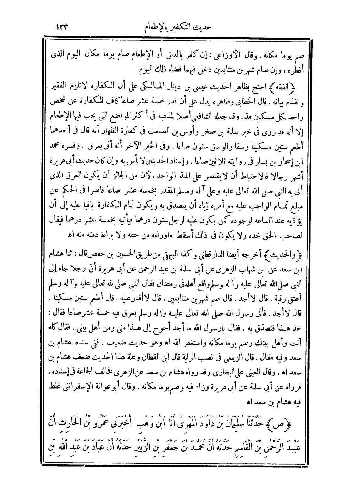 (والحديث) أخرجه أيضا الدارقطنى وكذا البيهقى من طريق الحسين بن حفص قال: ثناهشام ابن سعد عن ابن شهاب الزهرى عن أبى سلمة بن عبد الرحمن عن أبى هريرة أنّ رجلا جاء إلى النبى صلى الله تعالى عليه وعلى آله وسلم واقع أهله فى رمضان فقال النبى صلى الله تعالى عليه وآله وسلم أعتق رقبة. قال لا أجد. قال صم شهرين متتابعين. قال لا أقدر عليه. قال أطعم ستين مسكينا. قال لا أجد. فأتى رسول صلى الله تعالى عليه وآله وسلم بعرق فيه خمسة عشر صاعا فقال: خذ هذا فتصدّق به. فقال يا رسول الله ما أجد أحوج إلى هذا منى ومن أهل بيتى. فقال كله أنت وأهل بيتك وصم يوما مكانه واستغفر الله اهـ وهو حديث ضعيف. ففى سنده هشام بن سعد اهـ. وقال العينى على البخارى وقد رواه هشام بن سعد عن الزهرى فخالف الجماعة فى إسناده. فرواه عن أبى سلمة عن أبى هريرة وزاد فيه وصم يوما مكانه. وقال أبو عوانة الإسفرائنى غلط فيه هشام بن سعد اهـ.