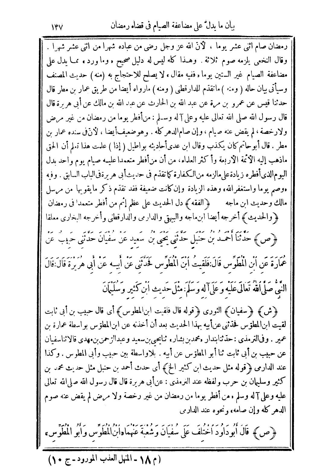رمضان صام اثني عشر يوما، لأنّ الله عز وجل رضي من عباده شهرا من اثني عشر شهرا. وقال النخعى يلزمه صوم ثلاثة. وهذا كله ليس له دليل صحيح "وما ورد" مما يدل علي مضاعفة الصيام غير الستين يوما "ففيه مقال" لا يصلح للاحتجاج به (منه) حديث المصنف وسيأتى بيان حاله (ومنه) ما تقدّم للدارقطنى (ومنه) ما رواه أيضا من طريق عمار بن مطر قال حدثنا قيس عن عمرو بن مرة عن عبد الله بن الحارث عن عبد الله بن مالك عن أبي هريرة قال قال رسول الله صلى الله تعالى عليه وعلى آله وسلم: من أفطر يوما من رمضان من غير مرض ولا رخصة، لم يقض عنه صيام، وإن صام الدهر كله. وهو ضعيف أيضا، لأنّ في سنده عمار بن مطر. قال أبو حاتم كان يكذب وقال ابن عدي أحاديثه بواطيل (إذا) علمت هذا تعلم أن الحق ما ذهب إليه الأئمة الأربعة وأكثر العلماء، من أن من أفطر متعمدا عليه صيام يوم واحد بدل اليوم الذى أفطره زيادة على ما لزمه من الكفارة كما تقدّم في حديث أبي هريرة في الباب السابق. وفيه "وصم يوما واستغفر الله" وهذه الزيادة وإن كانت ضعيفة فقد تقدّم ذكر ما يقويها من مرسل مالك وحديث ابن ماجه (الفقه) دل الحديث على عظم إثم من أفطر متعمدا في رمضان