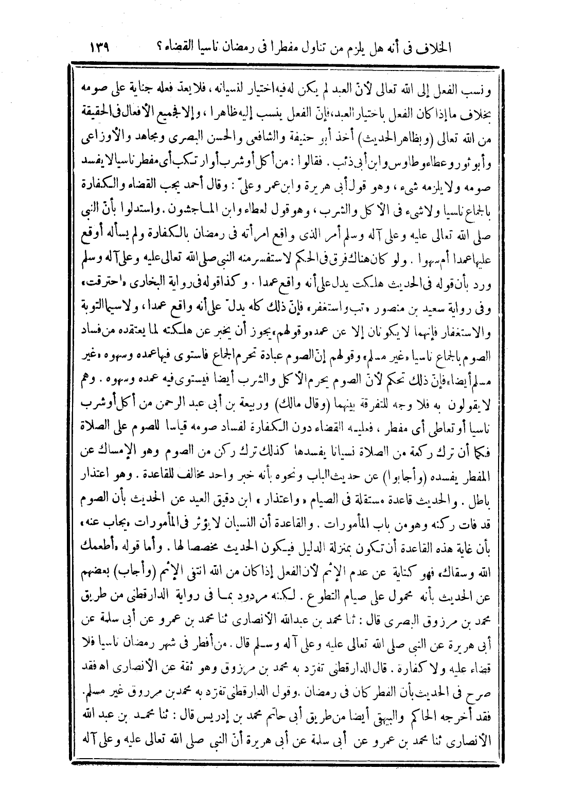 ونسب الفعل إلى الله تعالى لأنّ العبد لم يكن له فيه اختيار لنسيانه، فلا يعدّ فعله جناية على صومه بخلاف ما إذا كان الفعل باختيار العبد، فإنّ الفعل ينسب إليه ظاهرا، وإلا فجميع الأفعال في الحقيقة من الله تعالى (وبظاهر الحديث) أخذ أبو حنيفة والشافعى والحسن البصرى ومجاهد والأوزاعى وأبو ثور وعطاء وطاوس وابن أبي ذئب. فقالوا: من أكل أو شرب أو ارتكب أى مفطر ناسيا لا يفسد صومه ولا يلزمه شئ، وهو قول أبي هريرة وابن عمر وعلىّ: وقال أحمد يجب القضاء والكفارة بالجماع ناسيا ولا شئ في الأكل والشرب، وهو قول لعطاء وابن الماجشون. واستدلوا بأنّ النبي صلى الله تعالى عليه وعلى آله وسلم أمر الذى واقع امرأته في رمضان بالكفارة ولم يسأله أوقع عليها عمدا أم سهوا، ولو كان هناك فرق في الحكم لاستفسر منه النبي صلى الله تعالى عليه وعلى آله وسلم ورد بأن قوله في الحديث هلكت يدل على أنه واقع عمدا، وكذا قول في رواية البخارى "احترقت" وفي رواية سعيد بن منصور "تب واستغفر" فإنّ ذلك كله يدلّ على أنه واقع عمدا، ولا سيما التوبة والاستغفار فإنهما لا يكونان إلا عن عمد "وقولهم" يجوز أن يخير عن هلكته لما يعتقده من فساد الصوم بالجماع ناسيا "غير مسلم" وقولهم إنّ الصوم عبادة تحرم الجماع فاستوى فيها عمده وسهوه "غير مسلم أيضا" فإنّ ذلك تحكم لأنّ الصوم يحرم الأكل والشرب أيضا فيستوى فيه عمده وسهوه. وهم لا يقولون به فلا وجه للتفرقة بينهما (وقال مالك) وربيعة بن أبي عبد الرحمن من أكل أو شرب ناسيا أو تعاطى أى مفطر، فعليه القضاء دون الكفارة لفساد صومه قياسا للصوم على الصلاة فكما أن ترك ركعة من الصلاة نسيانا يفسدها كذلك ترك ركن من الصوم وهو الإمساك عن المفطر يفسده (وأجابوا) عن حديث الباب ونحوه بأنه خبر واحد مخالف للقاعدة. وهو اعتذار باطل. والحديث قاعدة مستقلة في الصيام "واعتذار" ابن دقيق العيد عن الحديث بأن الصوم قد فات ركنه وهو من باب المأمورات. والقاعدة أن النسيان لا يؤثر في المأمورات "يجاب عنه" بأن غاية هذه القاعدة أن تكون بمنزلة الدليل فيكون الحديث مخصصا لها. وأما قوله "أطعمك الله وسقاك" فهو كناية عن عدم الإثم لأن الفعل إذا كان من الله انتفى الإثم (وأجاب) بعضهم عن الحديث بأنه محمول على صيام التطوع. لكنه مردود بما في رواية الدارقطنى من طريق محمد بن مرزوق البصرى قال: ثنا محمد بن عبد الله الأنصارى ثنا محمد بن عمرو عن أبي سلمة عن أبي هريرة عن النبي صلى الله تعالى عليه وعلى آله وسلم قال. من أفطر في شهر رمضان ناسيا فلا قضاء عليه ولا كفارة، قال الدارقطنى تفرّد به محمد بن مرزوق وهو ثقة عن الأنصارى اهـ فقد صرح في الحديث بأن الفطر كان في رمضان وقول الدارقطنى تفرّد به محمد بن مرزوق غير مسلم. فقد أخرجه الحاكم والبيهقي أيضا من طريق أبي حاتم محمد بن إدريس قال: ثنا حمد بن عبد الله الأنصارى ثنا حمد بن عمرو عن أبي سلمة عن أبي هريرة أنّ النبي صلى الله تعالى عليه وعلى آله