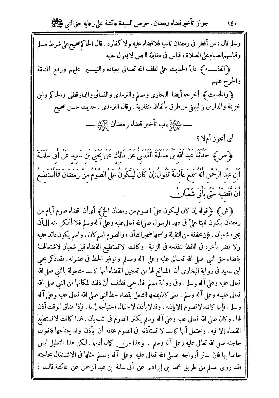 (ش) (قوله إن كان ليكون علىّ الصوم من رمضان الخ) أى أن قضاء صوم أيام من رمضان يكون ثابتا علىّ في عهد الرسول صلى الله تعالى عليه وعلى آله وسلم فلا أتمكن منه إلى أن يجئ شعبان. فإن مخففة من الثقيلة واسمها ضمير الشأن، والصوم اسم كان، واسم يكون عائد عليه ولا يضر تأخره في اللفظ لتقدّمه في الرّتبة. وكانت لا تستطيع القضاء قبل شعبان لاشتغالها بقضاء حق النبي صلى الله تعالى عليه وعلى آله وسلم وتوفير الحظ في عشرته. فقد ذكر يحيى ابن سعيد في رواية البخارى أن المانع لها من تعجيل القضاء أنها كانت مشغولة بالنبى صلى الله تعالى عليه وعلى آله وسلم. وفي رواية مسلم قال يحيى فظننت أنّ ذلك لمكانها من النبى صلى الله تعالى عليه وعلى آله وسلم. يعنى كان يمنعها الشغل بقضاء حظ النبى صلى الله تعالى عليه وعلى آله وسلم. فإنها كانت لا تصوم إلا بإذنه. وقد لا يأذن لاحتمال احتياجه إليها، فإذا ضاق الوقت أذن لها. وكان صلى الله تعالى عليه وعلى آله وسلم يكثر الصوم في شعبان. فلذا كانت لا تستطيع القضاء إلا فيه. ويحتمل أنها كانت لا تستأذنه في الصوم مخافة أن يأذن وقد يحتاجها فتفوت حاجته صلى الله تعالى عليه وعلى آله وسلم. وهذا من كمال أدبها. لكن هذا التعليل ليس خاصا بها فإنّ سائر أزواجه صلى الله تعالى عليه وعلى آله وسلم مثلها في الاشتغال بحاجته فقد روى مسلم من طريق حمد بن إبراهيم عن أبي سلمة بن عبد الرّحمن عن عائشة قالت: