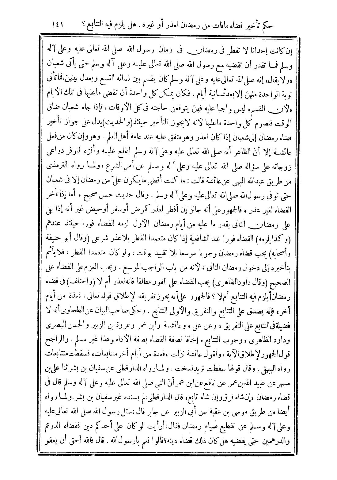 إن كانت إحدانا لا تفطر فى رمضان فى زمان رسول الله صلى الله تعالى عليه وعلى آله وسلم فما تقدر أن تقضيه مع رسول الله صلى الله تعالى عليه وعلى آله وسلم حتى يأتى شعبان "ولا يقال" إنه صلى الله تعالى عليه وعلى آله سلم كان يقسم بين نسائه التسع ويعدل بينهنّ فما تأتى نوبة الواحدة منهنّ إلا بعد ثمانية أيام. فكان يمكن كل واحدة أن تقضى ما عليها فى تلك الأيام "لأن القسم" ليس واجبا عليه فهنّ يتوقعن حاجته فى كل الأوقات، فإذا جاء شعبان ضاق الوقت فتصوم كل واحدة ما عليها لأنه لا يجوز التأخير (والحديث) يدل على جواز تأخير قضاء رمضان إلى شعبان إذا كان لعذر وهو متفق عليه عند عامة أهل العلم. وهو وإن كان من فعل عائشة إلا أن الظاهر أنه صلى الله تعالى عليه وعلى آله وسلم اطلع عليه وأقره لتوفر دواعى زوجاته على سؤاله صلى الله تعالى عليه وعلى آله وسلم عن أمر الشرع، ولما رواه الترمذى من طريق عبد الله البهى عن عائشة قالت: ما كنت أقضى ما يكون علىّ من رمضان إلا فى شعبان حتى توفى رسول الله صلى الله تعالى عليه وعلى آله وسلم. وقال حديث حسن صحيح "أما إذا تأخر القضاء لغير عذر" فالجمهور على أنه جائز إن أفطر لعذر كمرض أو سفر أو حيض غير أنه إذا بقى على رمضان الثانى بقدر ما عليه من أيام رمضان الأول لزمه القضاء فورا حينئذ عندهم (وكذا يلزمه) القضاء فورا عند الشافعية إذا كان متعمدا الفطر بلا عذر شرعي (وقال أبو حنيفة وأصحابه) يجب قضاء رمضان وجوبا موسعا بلا تقييد بوقت، ولو كان متعمدا الفطر، فلا يأثم بتأخيره إلى دخول رمضان الثانى، لأنه من باب الواجب الموسع. ويجب العزم على القضاء على الصحيح (وقال داود الظاهرى) يجب القضاء على الفور مطلقا فاته لعذر أم لا (واختلف) فى قضاء رمضان أيلزم فيه التتابع أم لا؟ فالجمهور على أنه يجوز تفريقه لإطلاق قوله تعالى {فَعِدَّةٌ مِنْ أَيَّامٍ أُخَرَ} فإنه يصدق على التتابع والتفريق والأولى التتابع. وحكى صاحب البيان عن الطحاوي أنه لا فضيلة في التتابع على التفريق "وعن على" وعائشة وابن عمر وعروة بن الزبير والحسن البصري وداود الظاهري "وجوب التتابع" إلحاقا لصفة القضاء بصفة الأداء وهذا غير مسلم. والراجح قول الجمهور لإطلاق الآية، ولقول عائشة نزلت "فعدة من أيام اخر متتابعات" فسقطت متتابعات رواه البيهقى. وقال قولها سقطت تريد نسخت. ولما رواه الدارقطنى عن سفيان بن بشر ثنا على بن مسهر عن عبيد الله بن عمر عن نافع عن ابن عمر أن النبى صلى الله تعالى عليه وعلى آله وسلم قال فى قضاء رمضان "إن شاء فرق وإن شاء تابع" قال الدراقطنى: لم يسنده غير سفيان بن بشر. ولما رواه أيضا من طريق موسى بن عقبة عن أبى الزبير عن جابر قال: سئل رسول الله صلى الله تعالى عليه وعلى آله وسلم عن تقطيع صيام رمضان فقال: أرأيت لو كان على أحدكم دين فقضاه الدرهم والدرهمين حتى يقضيه هل كان ذلك قضاء دينه؟ قالوا نعم يا رسول الله. قال فالله أحق أن يعفو