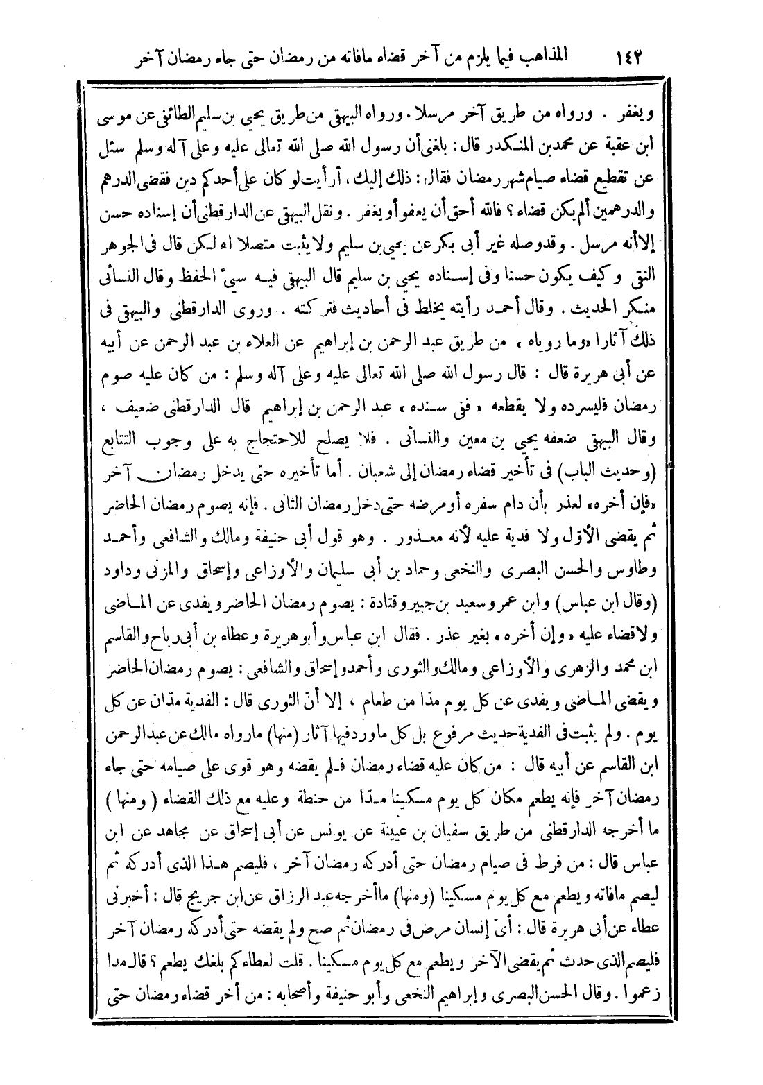 ويغفر. ورواه من طريق آخر مرسلا. ورواه البيهقى من طريق يحيى بن سليم الطائفى عن موسى ابن عقبة عن محمد بن المنكدر قال: بلغنى أن رسول الله صلى الله تعالى عليه وعلى آله وسلم سئل عن تقطيع قضاء صيام شهر رمضان فقال: ذلك إليك، أرأيت لو كان على احدكم دين فقضى الدرهم والدرهمين ألم يكن قضاء؟ فالله أحق ان يعفو أو يغفر. ونقل البيهقى عن الدارقطنى أن إسناده حسن إلا أنه مرسل. وقد وصله غير أبى بكر عن يحيى بن سليم ولا يثبت متصلا له لكن قال فى الجوهر النقى وكيف يكون حسنا وفى إسناده يحيى بن سليم قاله البيهقى فيه سيء الحفظ وقال النسائى منكر الحديث. وقال أحمد رأيته يخلط فى أحاديث فتركته. وروى الدارقطنى والبيهقى فى ذلك آثارا "وما روياه" من طريق عبد الرحمن بن إبراهيم عن العلاء بن عبد الرحمن عن أبيه عن أبى هريرة قال: قال رسول الله صلى الله تعالى عليه وعلى آله وسلم: من كان عليه صوم رمضان فليسرده ولا يقطعه "ففى سنده" عبد الرحمن بن إبراهيم قال الدارقطنى ضعيف، وقال البيهقى ضعفه يحيى بن معين والنسائى. فلا يصلح للاحتجاج به على وجوب التتابع (وحديث الباب) فى تأخير قضاء رمضان إلى شعبان. أما تأخيره حتى يدخل رمضان آخر "فإن أخره" لعذر بأن دام سفره أو مرضه حتى دخل رمضان الثانى. فإن يصوم رمضان الحاضر ثم يقضى الأول ولا فدية عليه لأنه معذور. وهو قول أبى حنيفة ومالك والشافعى وأحمد وطاوس والحسن البصرى والنخعى وحماد بن أبى سليمان والأوزاعى وإسحاق والمزنى وداود (وقال ابن عباس) وابن عمر وسعيد بن جبير وقتادة: يصوم رمضان الحاضر ويفدى عن الماضى ولا قضاء عليه "وإن أخره" بغير عذر. فقال ابن عباس وأبو هريرة وعطاء بن أبى رباح والقاسم ابن محمد والزهرى والأوزاعى ومالك والثورى وأحمد وإسحاق والشافعى: يصوم رمضان الحاضر ويقضى رمضان الماضى ويفدى عن كل يوم مدّا من طعام، إلا أنّ الثورى قال: الفدية مدّان عن كل يوم. ولم يثبت فى الفدية حديث مرفوع بل كل ما ورد فيها آثار (منها) ما رواه مالك عن عبد الرحمن ابن القاسم عن أبيه قال: من كان عليه قضاء رمضان فلم يقضه وهو قوى على صيامه حتى جاء رمضان آخر فإنه يطعم مكان كل يوم مسكينا مدّا من حنطة وعليه مع ذلك القضاء (ومنها) ما أخرجه الدارقطنى من طريق سفيان بن عيينة عن يونس عن أبى إسحاق عن مجاهد عن ابن عباس قال: من فرط فى صيام رمضان حتى أدركه رمضان آخر، فليصم هذا الذى أدركه ثم ليصم ما فاته ويطعم مع كل يوم مسكينا (ومنها) ما أخرجه عبد الرزاق عن ابن جريج قال: أخبرنى عطاء عن أبى هريرة قال: أى إنسان مرض فى رمضان ثم صح ولم يقضه حتى أدركه رمضان آخر فليصم الذى حدث ثم يقضى الآخر ويطعم مع كل يوم مسكينا. قلت لعطاء كم بلغك يطعم؟ قال مدا زعموا. وقال الحسن البصرى وإبراهيم النخعى وأبو حنيفة وأصحابه: من أخر قضاء رمضان حتى