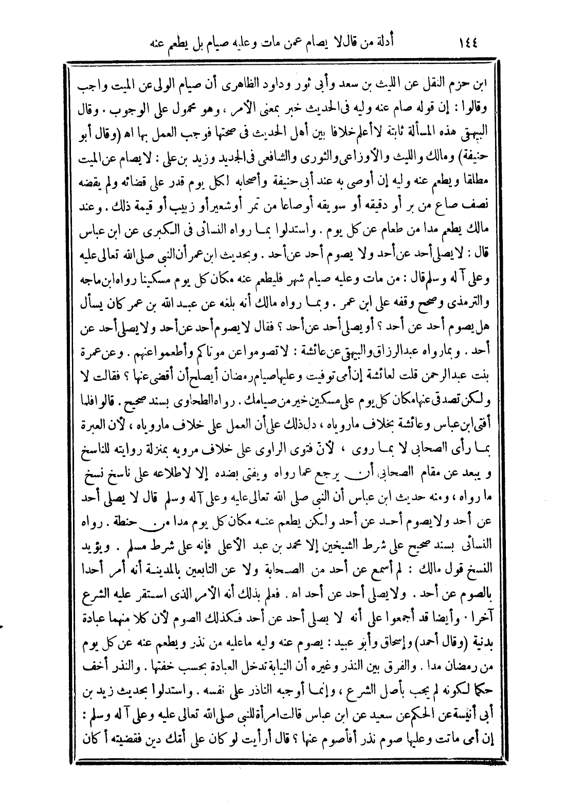ابن حزم النقل عن الليث بن سعد وأبى ثور وداود الظاهرى أن صيام الولى عن الميت واجب وقالوا: إن قوله صام عنه فى الحديث خبر بمعنى الأمر، وهو محمول على الوجوب. وقال البيهقى هذه المسألة ثابتة لا أعلم خلافا بين أهل الحديث فى صحتها فوجب العمل بها اهـ (وقال أبو حنيفة) ومالك والليث والأوزاعى والثورى والشافعى فى الجديد وزيد بن على: لا يصام عن الميت مطلقا ويطعم عنه وليه إن أوصى به عند أبى حنيفة وأصحابه لكل يوم قدر على قضائه ولم يقضه نصف صاع من بر أو دقيقه أو سويقه أو صاعا من تمر أو شعير أو زبيب أو قيمة ذلك. وعند مالك يطعم مدا من طعام عن كل يوم. واستدلوا بما رواه النسائى فى الكبرى عن ابن عباس قال: لا يصلى أحد عن أحد ولا يصوم احد عن أحد. وبحديث ابن عمر أن النبي صلى الله تعالى عليه وعلى آله وسلم قال: من مات وعليه صيام شهر فليطعم عنه مكان كل يوم مسكينا رواه ابن ماجه والترمذى وصحح وقفه على ابن عمر. وبما رواه مالك أنه بلغه عن عبد الله بن عمر كان يسأل هل يصوم أحد عن أحد؟ أو يصلى أحد عن أحد؟ فقال لا يصوم أحد عن احد ولا يصلى أحد عن أحد. وبما رواه عبد الرزاق والبيهقى عن عائشة: لا تصوموا عن موتاكم واطعموا عنهم. وعن عمرة بنت عبد الرحمن قلت لعائشة إن أمى توفيت وعليها صيام رمضان أيصلح أن أقضى عنها؟ فقالت لا ولكن تصدقى عنها مكان كل يوم على مسكين خير من صيامك. رواه الطحاوى بسند صحيح. قالوا فلما أفتى ابن عباس وعائشة بخلاف ما روياه، دل ذلك على أن العمل على خلاف ما روياه, لأن العبرة بما رأى الصحابي لا بما روى, لأنّ فتوى الراوى على خلاف مرويه بمنزلة روايته للناسخ ويبعد عن مقام الصحابى أن يرجع عما رواه ويفتى بضده إلا لاطلاعه على ناسخ نسخ ما رواه، ومنه حديث ابن عباس أن النبى صلى الله تعالى عليه وعلى آله وسلم قال لا يصلى أحد عن أحد ولا يصوم أحد عن أحد ولكن يطعم عنه مكان كل يوم مدا من حنطة. رواه النسائى بسند صحيح على شرط الشيخين إلا محمد بن عبد الأعلى فإنه على شرط مسلم. ويؤيد النسخ قول مالك: لم أسمع عن أحد من الصحابة ولا عن التابعين بالمدينة أن أمر أحدا بالصوم عن أحد. ولا يصلى أحد عن أحد اهـ. فعلم بذلك أن الأمر الذى استقر عليه الشرع آخرا. وأيضا قد أجمعوا على أنه لا يصلى أحد عن أحد فكذلك الصوم لأن كلا منهما عبادة بدنية (وقال أحمد) وإسحاق وأبو عبيد: يصوم عنه وليه ما عليه من نذر ويطعم عنه عن كل يوم من رمضان مدا. والفرق بين النذر وغيره أن النيابة تدخل العبادة بحسب خفتها. والنذر أخف حكما لكونه لم يجب بأصل الشرع, وإنما أوجبه الناذر على نفسه. واستدلوا بحديث زيد بن أبى أنيسة عن الحكم عن سعيد عن ابن عباس قالت امرأة للنبى صلى الله تعالى عليه وعلى آله وسلم: إن أمى ماتت وعليها صوم نذر أفأصوم عنها؟ قال أرأيت لو كان على أمّك دين فقضيته أكان
