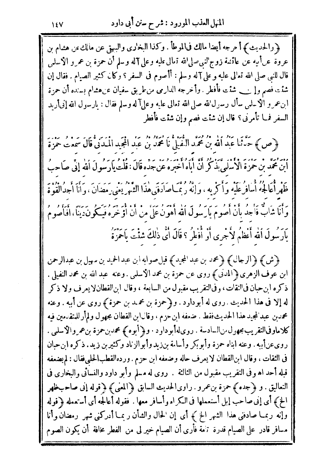 (ش) (الرجال) (محمد بن عبد المجيد) قيل صوابه ابن عبد الحميد بن سهيل بن عبد الرحمن ابن عوف الزهرى (المدني) روى عن حمزة بن محمد الأسلمي. وعنه عبد الله بن محمد النفيلي. ذكره ابن حبان في الثقات، وفى التقريب مقبول من السابعة: وقال ابن القطان لا يعرف ولا ذكر له إلا فى هذا الحديث. روى له أبو داود. و (حمزة بن محمد بن حمزة) روى عن أبيه. وعنه محمد بن عبد المجيد هذا الحديث فقط. ضعفه ابن حزم، وقال ابن القطان مجهول ولم أر للمتقدمين فيه كلاما وفى التقريب مجهول من السادسة. روى له أبو داود. و (أبوه) محمد بن حمزة بن عمرو الأسلمى. روى عن أبيه. وعنه ابناه حمزة وأبو بكر وأسامة بن زيد وأبو الزناد وكثير بن زيد. ذكره ابن حبان فى الثقات، وقال ابن القطان لا يعرف حاله وضعفه ابن حزم. ورده القطب الحلبي فقال: لم يضعفه قبله أحد وهو فى التقريب مقبول من الثالثة. روى له مسلم وأبو داود والنسائي والبخارى فى التعاليق. و (جده) حمزة بن عمرو. راوى الحديث السابق (المعنى)