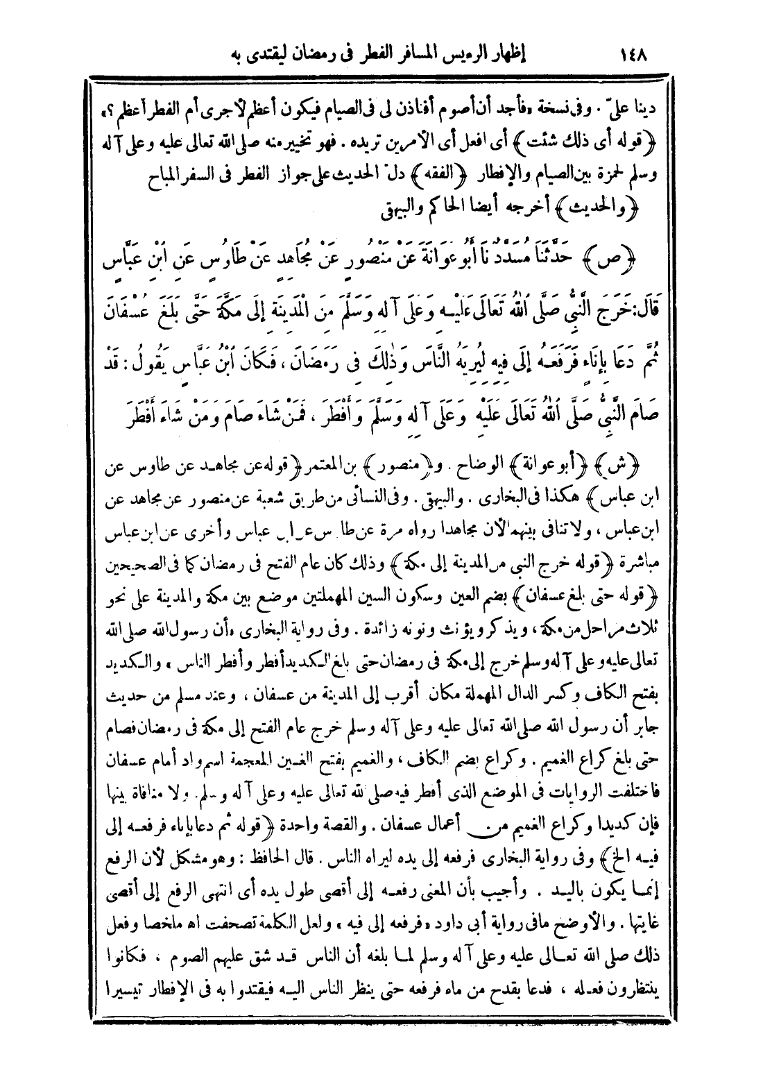 (ص) حَدَّثَنَا مُسَدَّدٌ نَا أَبُو عَوَانَةَ عَنْ مَنْصُورٍ عَنْ مُجَاهِدٍ عَنْ طَاوُسٍ عَنِ ابْنِ عَبَّاسٍ قَالَ: خَرَجَ النَّبِىُّ صَلَّى اللَّهُ تَعَالَى عَلَيْهِ وَعَلَى آلِهِ وَسَلَّمَ مِنَ الْمَدِينَةِ إِلَى مَكَّةَ حَتَّى بَلَغَ عُسْفَانَ ثُمَّ دَعَا بِإِنَاءٍ فَرَفَعَهُ إِلَى فِيهِ لِيُرِيَهُ النَّاسَ وَذَلِكَ فِى رَمَضَانَ, فَكَانَ ابْنُ عَبَّاسٍ يَقُولُ: قَدْ صَامَ النَّبِىُّ صَلَّى اللَّهُ تَعَالَى عَلَيْهِ وَعَلَى آلِهِ وَسَلَّمَ وَأَفْطَرَ, فَمَنْ شَاءَ صَامَ وَمَنْ شَاءَ أَفْطَرَ.