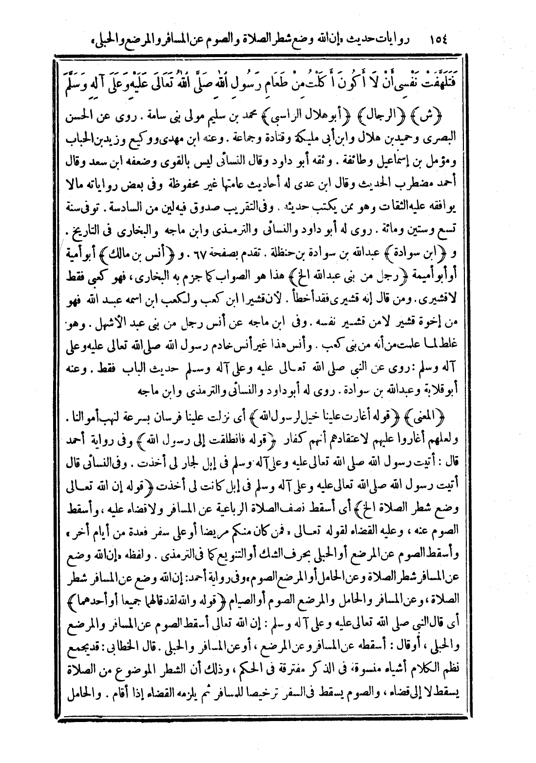 (ش) (الرجال) (وأبو هلال الراسبى) محمد بن سليم مولى بنى سامة. روى عن الحسن البصرى وحميد بن هلال وابن أبى مليكة وقتادة وجماعة. وعنه ابن مهدى ووكيع وزيد بن الحباب ومؤمل بن إسماعيل وطائفة. وثقه أبو داود وقال النسائى ليس بالقوى وضعفه ابن سعد وقال أحمد مضطرب الحديث وقال ابن عدى له أحاديث عامتها غير محفوظة وفى بعض رواياته ما لا يوافقه عليه الثقات وهو ممن يكتب حديثه. وفى التقريب صدوق فيه لين من السادسة. توفى سنة تسع وستين ومائة. روى له أبو داود والنسائى والترمذى وابن ماجه والبخارى فى التاريخ. و (ابن سوادة) عبد الله بن سوادة بن حنظلة. تقدم بصفحة 67. و (أنس بن مالك) أبو أمية أو أبو أميمة (رجل من بنى عبد الله الخ) هذا هو الصواب كما جزم به البخارى، فهو كعبى فقط لا قشيرى. ومن قال إنه قشيرى فقد أخطأ. لأن قشيرا ابن كعب ولكعب ابن اسمه عبد الله فهو من إخوة قشير لا من قشير نفسه. وفى ابن ماجه عن أنس رجل من بنى عبد الأشهل. وهو. غلط لما علمت من أنه من بنى كعب. وأنس هذا غير أنس خادم رسول الله صلى الله تعالى عليه وعلى آله وسلم: روى عن النبي صلى الله تعالى عليه وعلى آله وسلم حديث الباب فقط. وعنه أبو قلابة وعبد الله بن سوادة. روى له أبو داود والنسائى والترمذى وابن ماجه