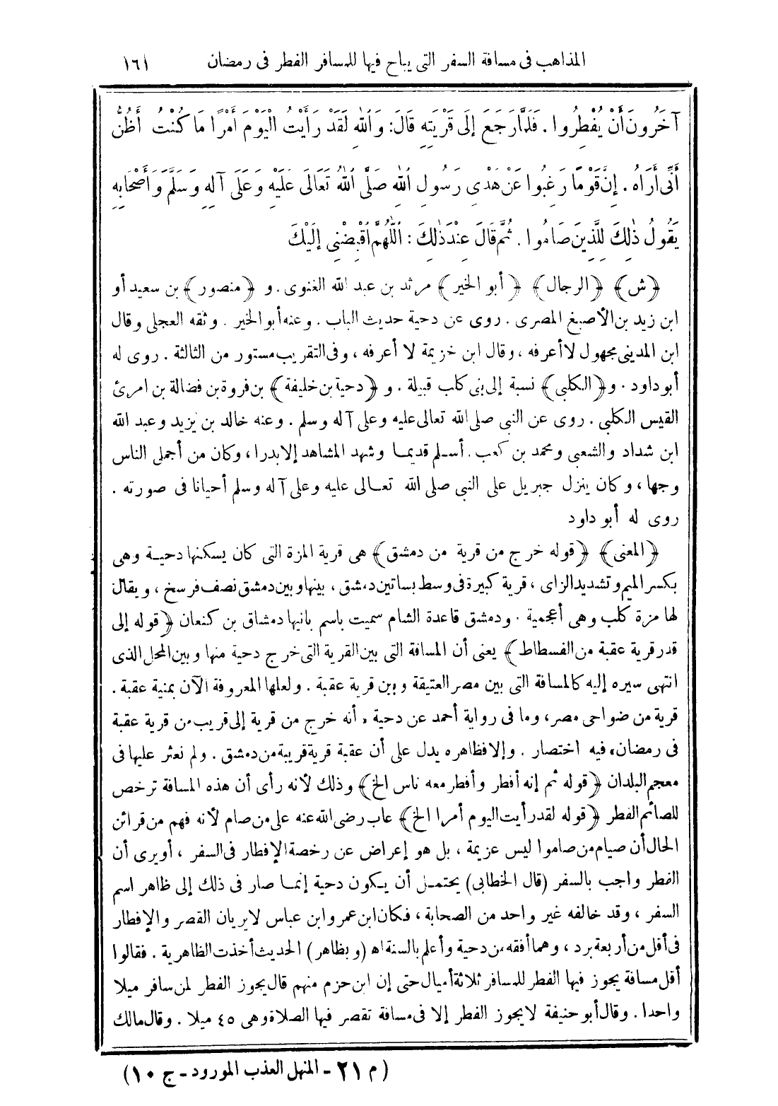 (ش) (الرجال) (أبو الخير) مرثد بن عبد الله الغنوى. و (منصور) بن سعيد أو ابن زيد بن الأصبغ المصرى. روى عن دحية حديث الباب. وعنه أبو الخير. وثقه العجلى وقال ابن المدينى مجهول لا أعرفه، وقال ابن خزيمة لا أعرفه، وفى التقريب مستور من الثالثة. روى له أبو داود. و (الكلبى) نسبة إلى بنى كلب قبيلة. و (دحية بن خليفة) بن فروة بن فضالة بن امرئ القيس الكلبى. روى عن النبى صلى الله تعالى عليه وعلى آله وسلم. وعنه خالد بن يزيد وعبد الله ابن شداد والشعبى ومحمد بن كعب. أسلم قديما وشهد المشاهد إلا بدرا، وكان من أجمل الناس وجها، وكان ينزل جبريل على النبى صلى الله تعالى عليه وعلى آله وسلم أحيانا فى صورته. روى له أبو داود