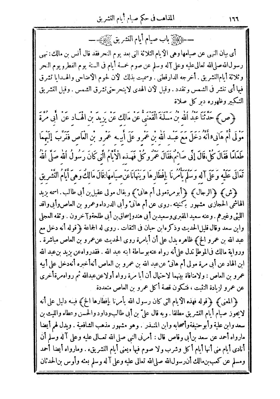 (ص) حَدَّثَنَا عَبْدُ اللَّهِ بْنُ مَسْلَمَةَ الْقَعْنَبِىُّ عَنْ مَالِكٍ عَنْ يَزِيدَ بْنِ الْهَادِ عَنْ أَبِى مُرَّةَ مَوْلَى أُمِّ هَانِئٍ أَنَّهُ دَخَلَ مَعَ عَبْدِ اللَّهِ بْنِ عَمْرٍو عَلَى أَبِيهِ عَمْرِو بْنِ الْعَاصِ فَقَرَّبَ إِلَيْهِمَا طَعَامًا فَقَالَ كُلْ, فَقَالَ إِنِّى صَائِمٌ, فَقَالَ عَمْرٌو كُلْ فَهَذِهِ الأَيَّامُ الَّتِى كَانَ رَسُولُ اللَّهِ صَلَّى اللَّهُ تَعَالَى عَلَيْهِ وَعَلَى آلِهِ وَسَلَّمَ يَأْمُرُنَا بِإِفْطَارِهَا وَيَنْهَانَا عَنْ صِيَامِهَا. قَالَ مَالِكٌ وَهِىَ أَيَّامُ التَّشْرِيقِ.