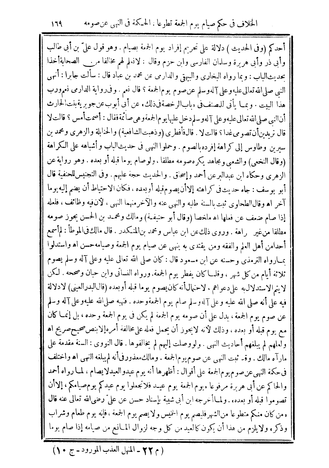 أحدكم (وفي الحديث) دلالة على تحريم إفراد يوم الجمعة بصيام. وهو قول عليّ بن أبي طالب وأبي ذر وأبي هريرة وسلمان الفارسي وابن حزم وقال: لا نعلم لهم مخالفًا من الصحابة أخذا بحديث الباب: وبما رواه البخاري والبيهقي والدارمي عن محمد بن عباد قال: سألت جابرًا: أنهى النبي صلى الله تعالى عليه وعلى آله وسلم عن صوم يوم الجمعة؟ قال نعم. وفي رواية الدارمي نعم ورب هذا البيت. وبما يأتي للمصنف في "باب الرخصة في ذلك" عن أبي أيوب عن جويرية بنت الحارث أن النبي صلى الله تعالى عليه وعلى آله وسلم دخل عليها يوم الجمعة وهى صائمة فقال: أصمت أمس؟ قالت لا قال تريدين أن تصومي غدًا؟ قالت لا. قال فأفطري (وذهبت الشافعية) والحنابلة والزهري ومحمد بن سيرين وطاوس إلى كراهة إفراده بالصوم. وحملوا النهي في حديث الباب وأشباهه على الكراهة (وقال النخعي) والشعبي ومجاهد يكره صومه مطلقًا، والحديث حجة عليهم. وفي التجنيس للحنفية قال أبو يوسف: جاء حديث في كراهته إلا أن يصوم قبله أو بعده، فكان الاحتياط أن يضم إليه يومًا آخر اهـ وقال الطحاوي ثبت بالسنة طلبه والنهي عنه والآخر منهما النهي، لأن فيه وظائف، فلعله إذا صام ضعف عن فعلها اهـ ملخصًا (وقال أبو حنيفة) ومالك ومحمد بن الحسن يجوز صومه مطلقًا من غير كراهة. وروى ذلك عن ابن عباس ومحمد بن المنكدر. قال مالك في الموطأ: لم أسمع أحدًا من أهل العلم والفقه ومن يقتدي به ينهى عن صيام يوم الجمعة وصيامه حسن اهـ واستدلوا بما رواه الترمذي وحسنه عن ابن مسعود قال: كان صلى الله تعالى عليه وعلى آله وسلم يصوم ثلاثة أيام من كل شهر، وقلما كان يفطر يوم الجمعة. ورواه النسائي وابن حبان وصححه. لكن لا يتم الاستدلال به على دعواهم. لاحتمال أنه كان يصوم يومًا قبله أو بعده (قال البدر العيني) لا دلالة فيه على أنه صلى الله عليه وعل آله وسلم صام يوم الجمعة وحده. فنهيه صلى الله عليه وعلى آله وسلم عن صوم يوم الجمعة، يدل على أنه صوم يوم الجمعة لم يكن في يوم الجمعة وحده، بل إنما كان مع يوم قبله أو بعده، وذلك لأنه لا يجوز أن يحمل فعله على مخالفة أمره إلا بنص صحيح صريح اهـ ولعلهم لم يبلغهم أحاديث النهي. ولو وصلت إليهم لم يخالفوها. قال النووي: السنة مقدمة على ما رآه مالك. وقد ثبت النهي عن صوم يوم الجمعة. ومالك معذور في أنه لم يبلغه النهي اهـ واختلف في حكمة النهي عن يوم الجمعة على أقوال: أظهرها أنه يوم عيد والعيد لا يصام، لما رواه أحمد والحاكم عن أبي هريرة مرفوعًا "يوم الجمعة يوم عيد فلا تجعلوا يوم عيدكم يوم صيامكم، إلا أن تصوموا قبله أو بعده". ولما أخرجه ابن أبي شيبة بإسناد حسن عن عليّ رضي الله تعالى عنه قال "من كان منكم متطوعًا من الشهر فليصم يوم الخميس ولا يصم يوم الجمعة، فإنه يوم طعام وشراب وذكر" ولا يلزم من هذا أن يكون كالعيد من كل وجه لزوال المانع من صيامه إذا صام يومًا