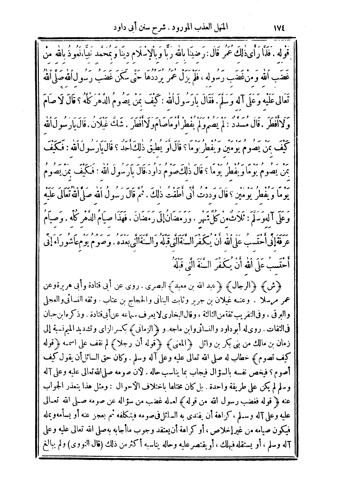 قَوْلِهِ. فَلَمَّا رَأَى ذَلِكَ عُمَرُ قَالَ: رَضِينَا بِاللَّهِ رَبًّا وَبِالإِسْلاَمِ دِينًا وَبِمُحَمَّدٍ نَبِيًّا, نَعُوذُ بِاللَّهِ مِنْ غَضَبِ اللَّهِ وَمِنْ غَضَبِ رَسُولِهِ, فَلَمْ يَزَلْ عُمَرُ يُرَدِّدُهَا حَتَّى سَكَنَ غَضَبُ رَسُولِ اللَّهِ صَلَّى اللَّهُ تَعَالَى عَلَيْهِ وَعَلَى آلِهِ وَسَلَّمَ. فَقَالَ يَا رَسُولَ اللَّهِ: كَيْفَ بِمَنْ يَصُومُ الدَّهْرَ كُلَّهُ؟ قَالَ لاَ صَامَ وَلاَ أَفْطَرَ. قَالَ مُسَدَّدٌ: لَمْ يَصُمْ وَلَمْ يُفْطِرْ أَوْ مَا صَامَ وَلاَ أَفْطَرَ. شَكَّ غَيْلاَنُ. قَالَ يَا رَسُولَ اللَّهِ كَيْفَ بِمَنْ يَصُومُ يَوْمَيْنِ وَيُفْطِرُ يَوْمًا؟ قَالَ أَوَيُطِيقُ ذَلِكَ أَحَدٌ؟ قَالَ يَا رَسُولَ اللَّهِ: فَكَيْفَ بِمَنْ يَصُومُ يَوْمًا وَيُفْطِرُ يَوْمًا؟ قَالَ ذَلِكَ صَوْمُ دَاوُدَ. قَالَ يَا رَسُولَ اللَّهِ: فَكَيْفَ بِمَنْ يَصُومُ يَوْمًا وَيُفْطِرُ يَوْمَيْنِ؟ قَالَ وَدِدْتُ أَنِّى أَطَقْتُ ذَلِكَ. ثُمَّ قَالَ رَسُولُ اللَّهِ صَلَّى اللَّهُ تَعَالَى عَلَيْهِ وَعَلَى آلِهِ وَسَلَّمَ: ثَلاَثٌ مِنْ كُلِّ شَهْرٍ, وَرَمَضَانُ إِلَى رَمَضَانَ, فَهَذَا صِيَامُ الدَّهْرِ كُلِّهِ. وَصِيَامُ عَرَفَةَ إِنِّى أَحْتَسِبُ عَلَى اللَّهِ أَنْ يُكَفِّرَ السَّنَةَ الَّتِى قَبْلَهُ وَالسَّنَةَ الَّتِى بَعْدَهُ. وَصَوْمُ يَوْمِ عَاشُورَاءَ إِنِّى أَحْتَسِبُ عَلَى اللَّهِ أَنْ يُكَفِّرَ السَّنَةَ الَّتِى قَبْلَهُ.