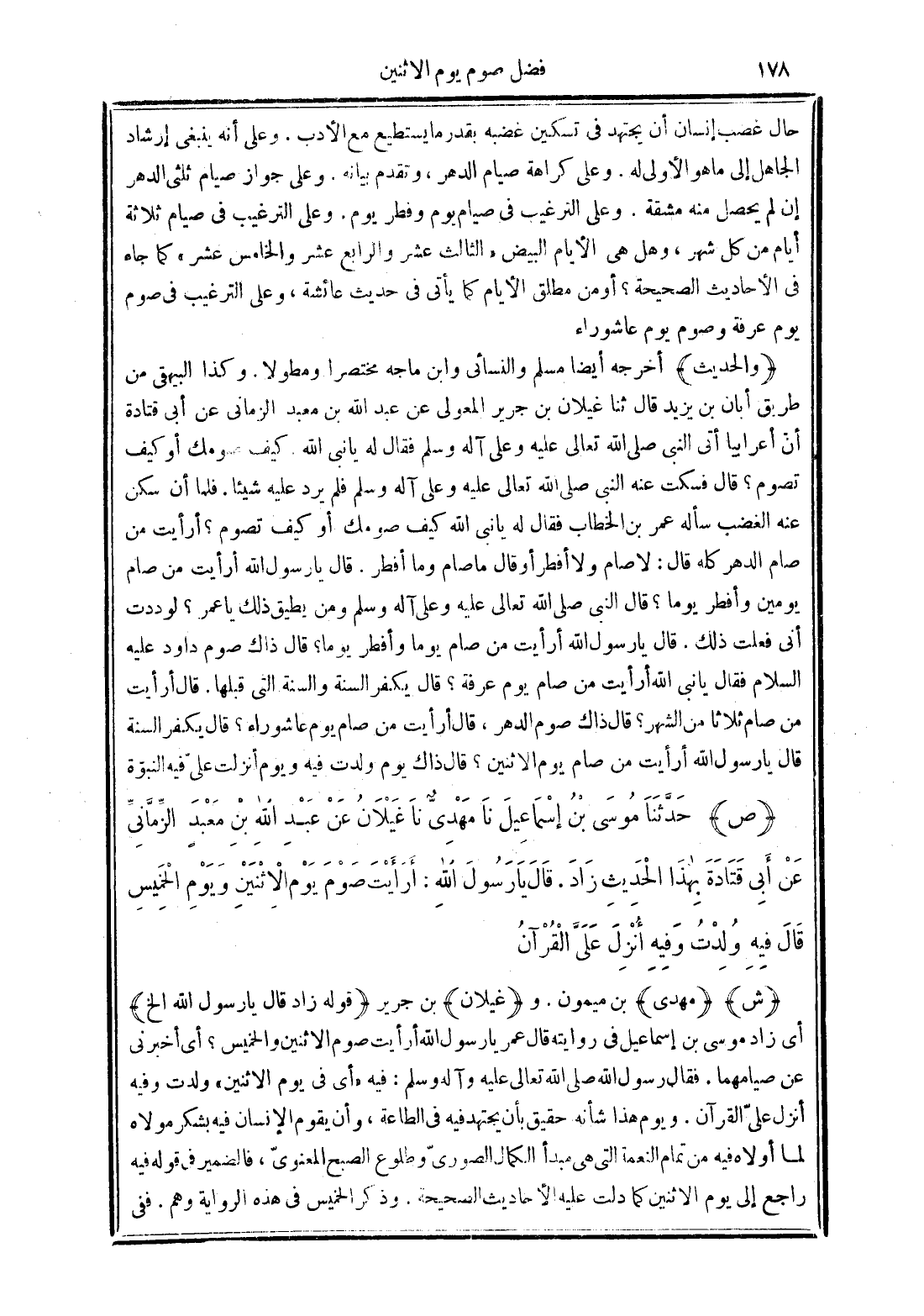 (قوله زاد قال يا رسول الله الخ) أى زاد موسى بن إسماعيل فى روايته قال عمر يا رسول الله أرأيت صوم الاثنين والخميس؟ أى أخبرنى عن صيامهما. فقال رسول الله صلى الله تعالى عليه وعلى آله وسلم: فيه "أى فى يوم الاثنين" ولدت وفيه أنزل علىّ القرآن. ويوم هذا شأنه حقيق بأن يجتهد فيه فى الطاعة, وأن يقوم الإنسان فيه بشكر مولاه لما أولاه فيه من تمام النعمة التى هى مبدأ الكمال الصورىّ وطلوع الصبح المعنوىّ, فالضمير فى قوله فيه راجع إلى يوم الاثنين كما دلت عليه الأحاديث الصحيحة. وذكر الخميس فى هذه الرواية وهم. ففى