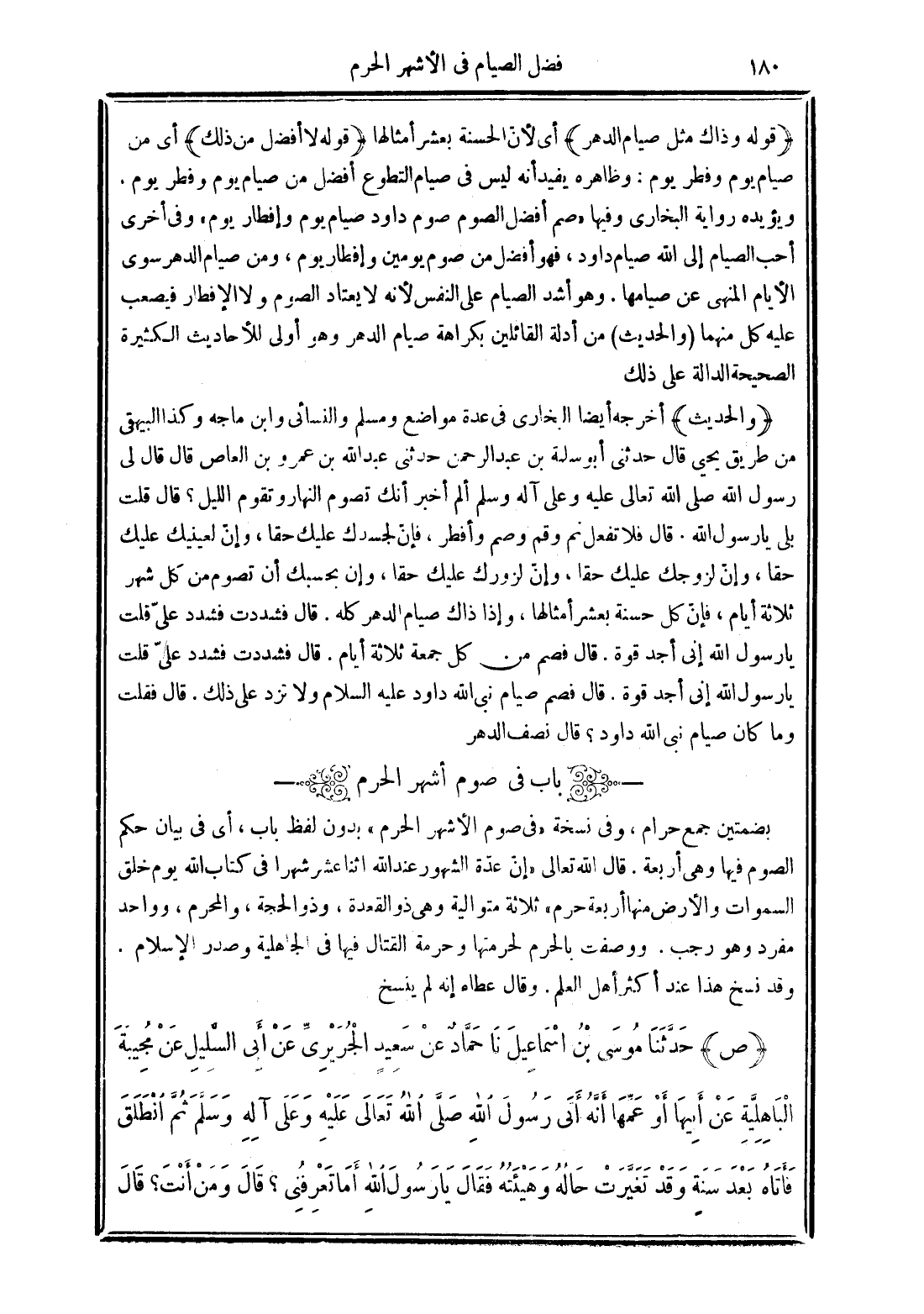 بضمتين جمع حرام, وفى نسخة "فى صوم الأشهر الحرم" بدون لفظ باب, أى فى بيان حكم الصوم فيها وهى أربعة. قال الله تعالى {إِنَّ عِدَّةَ الشُّهُورِ عِنْدَ اللَّهِ اثْنَا عَشَرَ شَهْرًا فِي كِتَابِ اللَّهِ يَوْمَ خَلَقَ السَّمَاوَاتِ وَالْأَرْضَ مِنْهَا أَرْبَعَةٌ حُرُمٌ} ثلاثة متوالية وهى ذو القعدة, وذو الحجة, والمحرم, وواحد مفرد وهو رجب. ووصفت بالحرم لحرمتها وحرمة القتال فيها فى الجاهلية وصدر الإسلام. وقد نسخ هذا عند أكثر أهل العلم. وقال عطاء إنه لم ينسخ