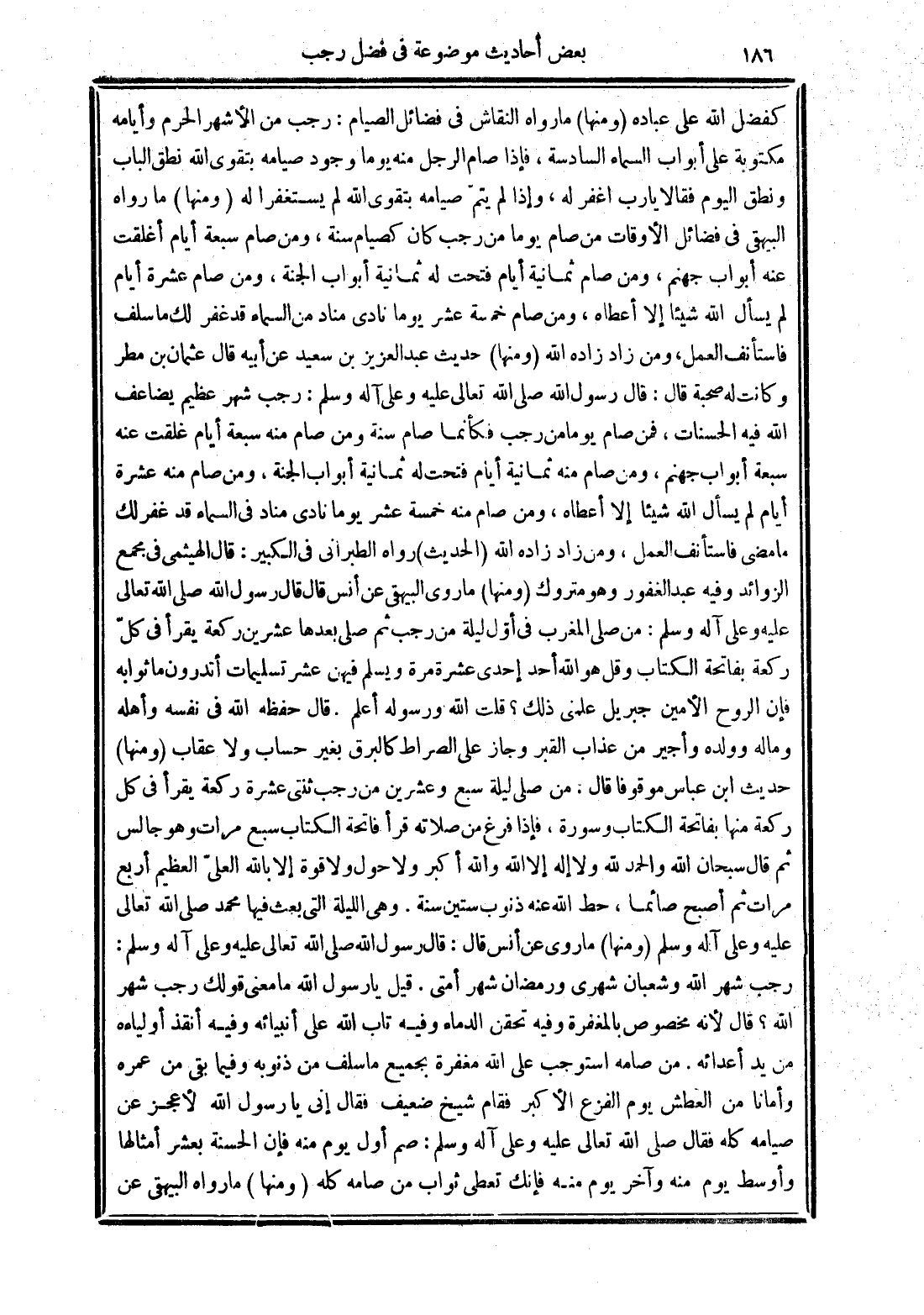 كفضل الله على عباده (ومنها) ما رواه النقاش في فضائل الصيام: رجب من الأشهر الحرم وأيامه مكتوبة على أبواب السماء السادسة, فإذا صام الرجل منه يوما وجود صيامه بتقوى الله نطق الباب ونطق اليوم فقالا يا رب اغفر له, وإذا لم يتمّ صيامه بتقوى الله لم يستغفرا له (ومنها) ما رواه البيهقي في فضائل الأوقات من صام يوما من رجب كان كصيام سنة, ومن صام سبعة أيام أغلقت عنه أبواب جهنم, ومن صام ثمانية أيام فتحت له ثمانية أبواب الجنة, ومن صام عشرة أيام لم يسأل الله شيئا إلا أعطاه, ومن صام خمسة عشر يوما نادى مناد من السماء قد غفر لك ما قد سلف فاستأنف العمل, ومن زاد زاده الله (ومنها) حديث عبد العزيز بن سعيد عن أبيه قال عثمان بن مطر وكانت له صحبة قال: قال رسول الله صلى الله تعالى عليه وعلى آله وسلم: رجب شهر عظيم يضاعف الله فيه الحسنات, فمن صام يوما من رجب فكأنما صام سنة ومن صام منه سبعة أيام غلقت عنه سبعة أبواب جهنم, ومن صام منه ثمانية أيام فتحت له ثمانية أبواب الجنة, ومن صام منه عشرة أيام لم يسأل الله شيئا إلا أعطاه, ومن صام منه خمسة عشر يوما نادى مناد في السماء قد غفر لك ما مضى فاستأنف العمل, ومن زاد زاده الله (الحديث) رواه الطبراني في الكبير: قال الهيثمي في مجمع الزوائد وفيه عبد الغفور وهو متروك (ومنها) ما روى البيهقي عن أنس قال قال رسول الله صلى الله تعالى عليه وعلى آله وسلم: من صلى المغرب في أوّل ليلة من رجب ثم صلى بعدها عشرين ركعة يقرأ في كلّ ركعة بفاتحة الكتاب وقل هو الله أحد إحدى عشرة مرة ويسلم فيهن عشر تسليمات أتدرون ما ثوابه فإن الروح الأمين جبريل علمني ذلك؟ قلت الله ورسوله أعلم. قال حفظه الله في نفسه وأهله وماله وولده وأجير من عذاب القبر وجاز على الصراط كالبرق بغير حساب ولا عقاب (ومنها) حديث ابن عباس موقوفا قال: من صلى ليلة سبع وعشرين من رجب ثنتي عشرة ركعة يقرأ في كل ركعة منها بفاتحة الكتاب وسورة, فإذا فرغ من صلاته قرأ فاتحة الكتاب سبع مرات وهو جالس ثم قال سبحان الله والحمد لله ولا إله إلا الله والله أكبر ولا حول ولا قوة إلا بالله العليّ العظيم أربع مرات ثم أصبح صائما, حط الله عنه ذنوب ستين سنة. وهي الليلة التي بعث فيها محمد صلى الله تعالى عليه وعلى آله وسلم (ومنها) ما روى عن أنس قال: قال رسول الله صلى الله تعالى عليه وعلى آله وسلم: رجب شهر الله وشعبان شهري ورمضان شهر أمتي. قيل يا رسول الله ما معنى قولك رجب شهر الله؟ قال لأنه مخصوص بالمغفرة وفيه تحقن الدماء وفيه تاب الله على أنبيائه وفيه أنقذ أولياءه من يد أعدائه. من صامه استوجب على الله مغفرة بجميع ما سلف من ذنوبه وفيما بقى من عمره وأمانا من العطش يوم الفزع الأكبر فقام شيخ ضعيف فقال إني يا رسول الله لأعجز عن صيامه كله فقال صلى الله تعالى عليه وعلى آله وسلم: صم أول يوم منه فإن الحسنة بعشر أمثالها وأوسط يوم منه وآخر يوم منه فإنك تعطى ثواب من صامه كله (ومنها) ما رواه البيهقي عن
