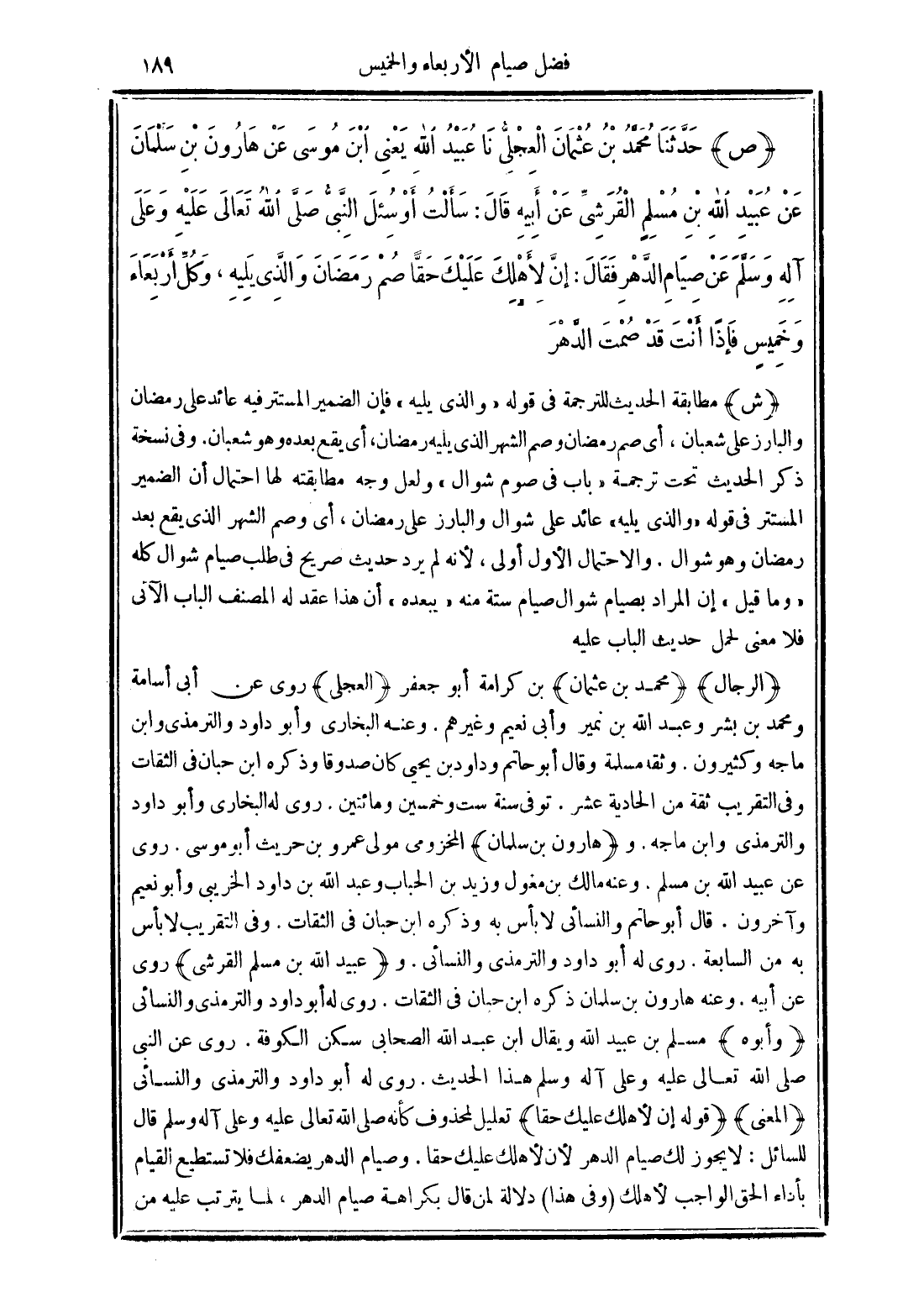 (الرجال) (محمد بن عثمان) بن كرامة أبو جعفر (العجلي) روى عى أبى أسامة ومحمد بن بشر وعبد الله بن نمير وأبى نعيم وغيرهم وعنه البخارى وأبو داود والترمذى وابن ماجه وكثيرون. وثقه مسلمة وقال أبو حاتم وداود بن يحيى كان صدوقا وذكره ابن حبان فى الثقات وفى التقريب ثقة من الحادية عشر. توفى سنة ست وخمسين ومائتين. روى له البخارى وأبو داود والترمذى وابن ماجه. و (هارون بن سلمان) المخزومى مولى عمرو بن حريث أبو موسى. روى عن عبيد الله بن مسلم. وعنه مالك بن مغول وزيد بن الحباب وعبد الله بن داود الخريبى وأبو نعيم وآخرون. قال أبو حاتم والنسائي لا بأس به وذكره ابن حبان فى الثقات. وفى التقريب لا بأس به من السابعة. روى له أبو داود والترمذى والنسائي. و (عبيد الله بن مسلم القرشى) روى عن أبيه. وعنه هارون بن سلمان ذكره ابن حبان فى الثقات. روى له أبو داود والترمذى والنسائى (وأبوه) مسلم بن عبيد الله ويقال ابن عبد الله الصحابى سكن الكوفة. روى عن النبي صلى الله تعالى عليه وعلى آله وسلم هذا الحديث. روى له أبو داود والترمذى والنسائي (المعنى)