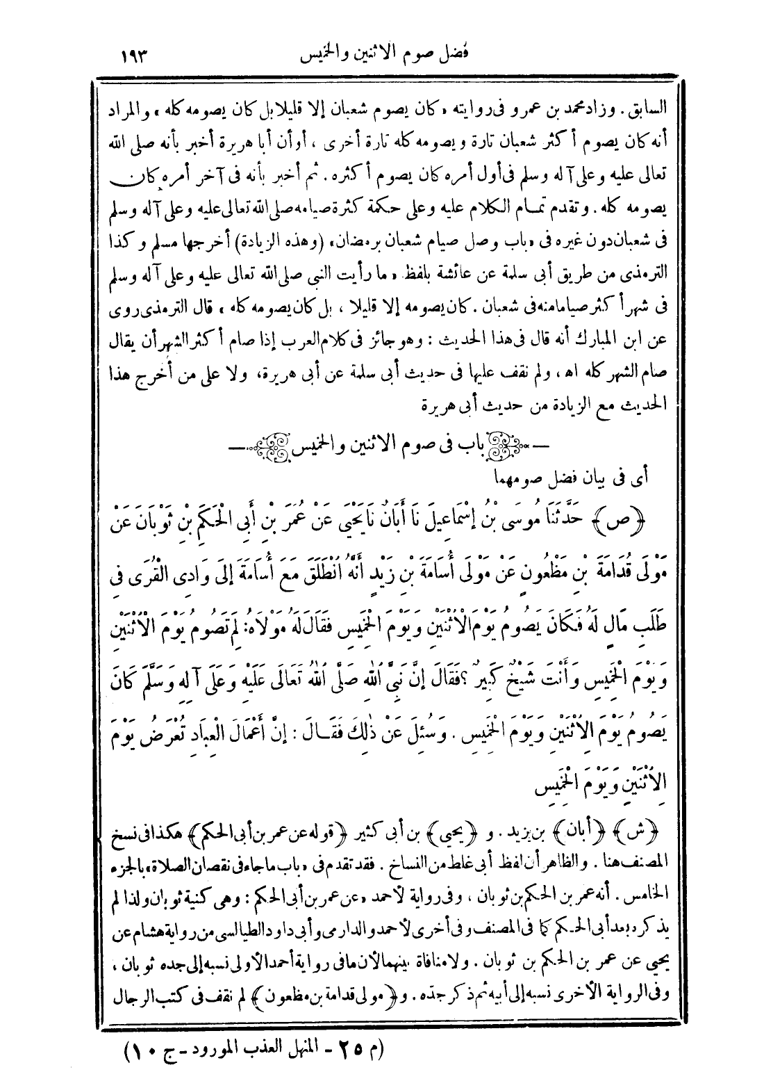 (ص) حَدَّثَنَا مُوسَى بْنُ إِسْمَاعِيلَ نَا أَبَانُ نَا يَحْيَى عَنْ عُمَرَ بْنِ أَبِى الْحَكَمِ بْنِ ثَوْبَانَ عَنْ مَوْلَى قُدَامَةَ بْنِ مَظْعُونٍ عَنْ مَوْلَى أُسَامَةَ بْنِ زَيْدٍ أَنَّهُ انْطَلَقَ مَعَ أُسَامَةَ إِلَى وَادِى الْقُرَى فِى طَلَبِ مَالٍ لَهُ فَكَانَ يَصُومُ يَوْمَ الاِثْنَيْنِ وَيَوْمَ الْخَمِيسِ فَقَالَ لَهُ مَوْلاَهُ: لِمَ تَصُومُ يَوْمَ الاِثْنَيْنِ وَيَوْمَ الْخَمِيسِ وَأَنْتَ شَيْخٌ كَبِيرٌ؟ فَقَالَ إِنَّ نَبِىَّ اللَّهِ صَلَّى اللَّهُ تَعَالَى عَلَيْهِ وَعَلَى آلِهِ وَسَلَّمَ كَانَ يَصُومُ يَوْمَ الاِثْنَيْنِ وَيَوْمَ الْخَمِيسِ. وَسُئِلَ عَنْ ذَلِكَ فَقَالَ: إِنَّ أَعْمَالَ الْعِبَادِ تُعْرَضُ يَوْمَ الاِثْنَيْنِ وَيَوْمَ الْخَمِيسِ.
