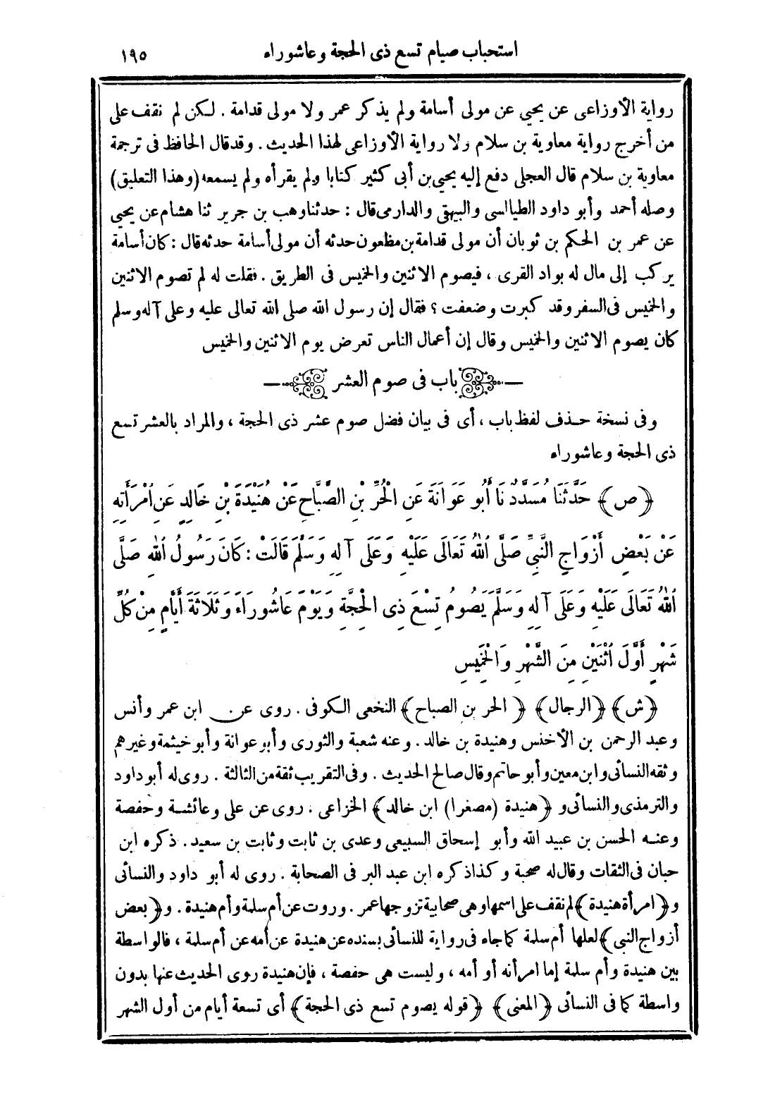 (ش) (الرجال) (الحر بن الصباح) النخعى الكوفى. روى عن ابن عمر وأنس وعبد الرحمن بن الأخنس وهنيدة بن خالد. وعنه شعبة والثورى وأبو عوانة وابو خيثمة وغيرهم وثقه النسائى وابن معين وأبو حاتم وقال صالح الحديث. وفى التقريب ثقة من الثالثة. روى له أبو داود والترمذى والنسائى و (هنيدة (مصغرا) ابن خالد) الخزاعى. روى عن على وعائشة وحفصة وعنه الحسن بن عبيد الله وأبو إسحاق السبيعى وعدى بن ثابت وثابت بن سعيد. ذكره ابن حبان فى الثقات وقال له صحبة وكذا ذكره ابن عبد البر فى الصحابة. روى له أبو داود والنسائى و (امرأة هنيدة) لم نقف على اسمها وهى صحابية تزوجها عمر. وروت عن أم سلمة وأم هنيدة. و (بعض أزواج النبى) لعلها أم سلمة كما جاء فى رواية للنسائى بسنده عن هنيدة عن أمه عن أم سلمة، فالواسطة بين هنيدة وأم سلمة إما امرأته أو أمه، وليست هى حفصة، فإن هنيدة روى الحديث عنها بدون واسطة كما فى النسائى (المعنى)