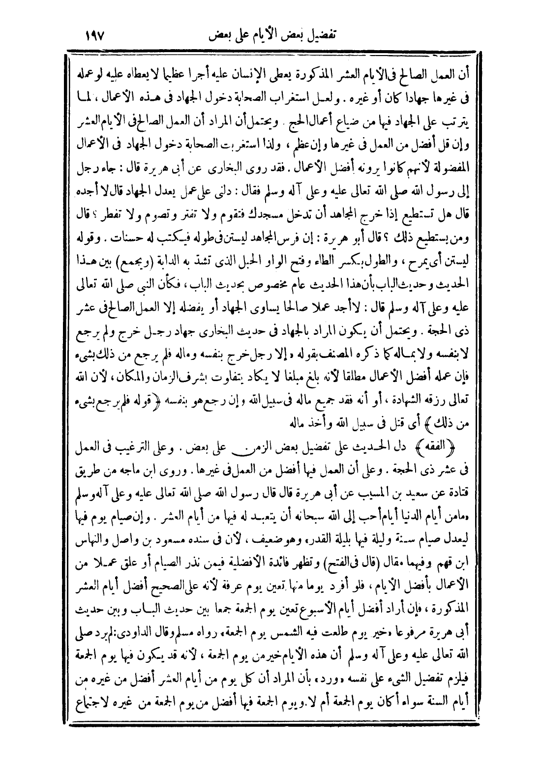 أن العمل الصالح في الأيام العشر المذكورة يعطى الإنسان عليه أجرا عظيما لا يعطاه عليه لو عمله في غيرها جهادا كان أو غيره. ولعل استغراب الصحابة دخول الجهاد في هذه الأعمال، لما يترتب على الجهاد فيها من ضياع أعمال الحج. ويحتمل أن المراد أن العمل الصالح في الأيام العشر وإن قل أفضل من العمل في غيرها وإن عظم، ولذا استغربت الصحابة دخول الجهاد في الأعمال المفضولة لأنهم كانوا يرونه أفضل الأعمال. فقد روى البخارى عن أبي هريرة قال: جاء رجل إلى رسول الله صلى الله تعالى عليه وعلى آله وسلم فقال: دلنى على عمل يعدل الجهاد قال لا أجده قال هل تستطيع إذا خرج المجاهد أن تدخل مسجدك فتقوم ولا تفتر وتصوم ولا تفطر؟ قال ومن يستطيع ذلك؟ قال أبو هريرة: إن فرس المجاهد ليستن في طوله فيكتب له حسنات. وقوله ليستن أي يمرح، والطول بكسر الطاء وفتح الواو الحبل الذي تشدّ به الدابة (ويجمع) بين هذا الحديث وحديث الباب بأن هذا الحديث عام مخصوص بحديث الباب، فكأن النبى صلى الله تعالى عليه وعلى آله وسلم قال: لا أجد عملا صالحا يساوى الجهاد أو يفضله إلا العمل الصالح في عشر ذى الحجة. ويحتمل أن يكون المراد بالجهاد في حديث البخارى جهاد رجل خرج ولم يرجع لا بنفسه ولا بماله كما ذكره المصنف بقوله "إلا رجل خرج بنفسه وماله فلم يرجع من ذلك بشئ فإن عمله أفضل الأعمال مطلقا لأنه بلغ مبلغا لا يكاد يتفاوت بشرف الزمان والمكان، لأن الله تعالى رزقه الشهادة، أو أنه فقد جميع ماله في سبيل الله وإن رجع هو بنفسه