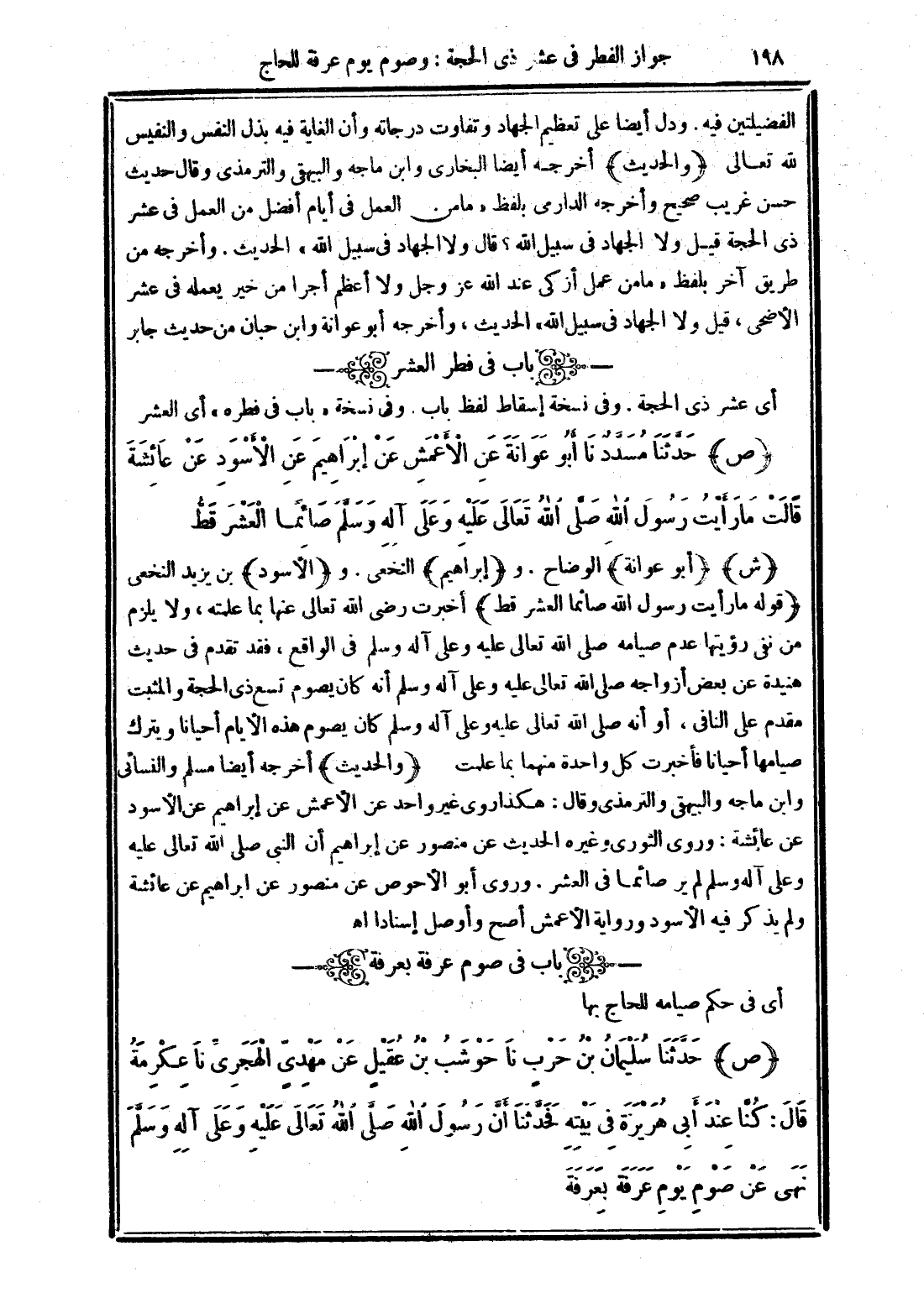 (قوله ما رأيت رسول الله صائما العشر قط) أخبرت رضى الله تعالى عنها بما علمته، ولا يلزم من نفى رؤيتها عدم صيامه صلى الله تعالى عليه وعلى آله وسلم في الواقع، فقد تقدم في حديث هنيدة عن بعض أزواجه صلى الله تعالى عليه وعلى آله وسلم أنه كان يصوم تسع ذى الحجة والمثبت مقدم على النافي، أو أنه صلى الله تعالى عليه وعلى آله وسلم كان يصوم هذه الأيام أحيانا ويترك صيامها أحيانا فأخبرت كل واحدة منهما بما علمت (والحديث) أخرجه أيضا مسلم والنسائي وابن ماجه والبيهقي والترمذى وقال: هكذا روى غير واحد عن الأعمش عن إبراهيم عن الأسود عن عائشة: وروى الثورى وغيره الحديث عن منصور عن إبراهيم أن النبي صلى الله تعالى عليه وعلى آله وسلم لم ير صائما في العشر. وروى أبو الأحوص عن منصور عن إبراهيم عن عائشة ولم يذكر فيه الأسود ورواية الأعمش أصح وأوصل إسنادا اهـ