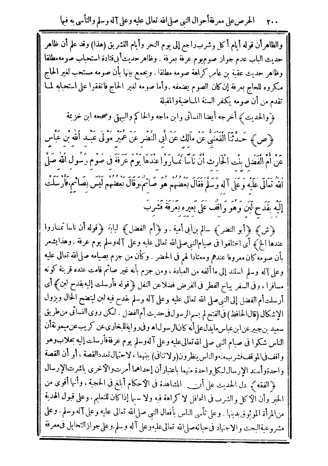 (ص) حَدَّثَنَا الْقَعْنَبِىُّ عَنْ مَالِكٍ عَنْ أَبِى النَّضْرِ عَنْ عُمَيْرٍ مَوْلَى عَبْدِ اللَّهِ بْنِ عَبَّاسٍ عَنْ أُمِّ الْفَضْلِ بِنْتِ الْحَارِثِ أَنَّ نَاسًا تَمَارَوْا عِنْدَهَا يَوْمَ عَرَفَةَ فِى صَوْمِ رَسُولِ اللَّهِ صَلَّى اللَّهُ تَعَالَى عَلَيْهِ وَعَلَى آلِهِ وَسَلَّمَ فَقَالَ بَعْضُهُمْ هُوَ صَائِمٌ, وَقَالَ بَعْضُهُمْ لَيْسَ بِصَائِمٍ, فَأَرْسَلَتْ إِلَيْهِ بِقَدَحِ لَبَنٍ وَهُوَ وَاقِفٌ عَلَى بَعِيرِهِ بِعَرَفَةَ فَشَرِبَ.