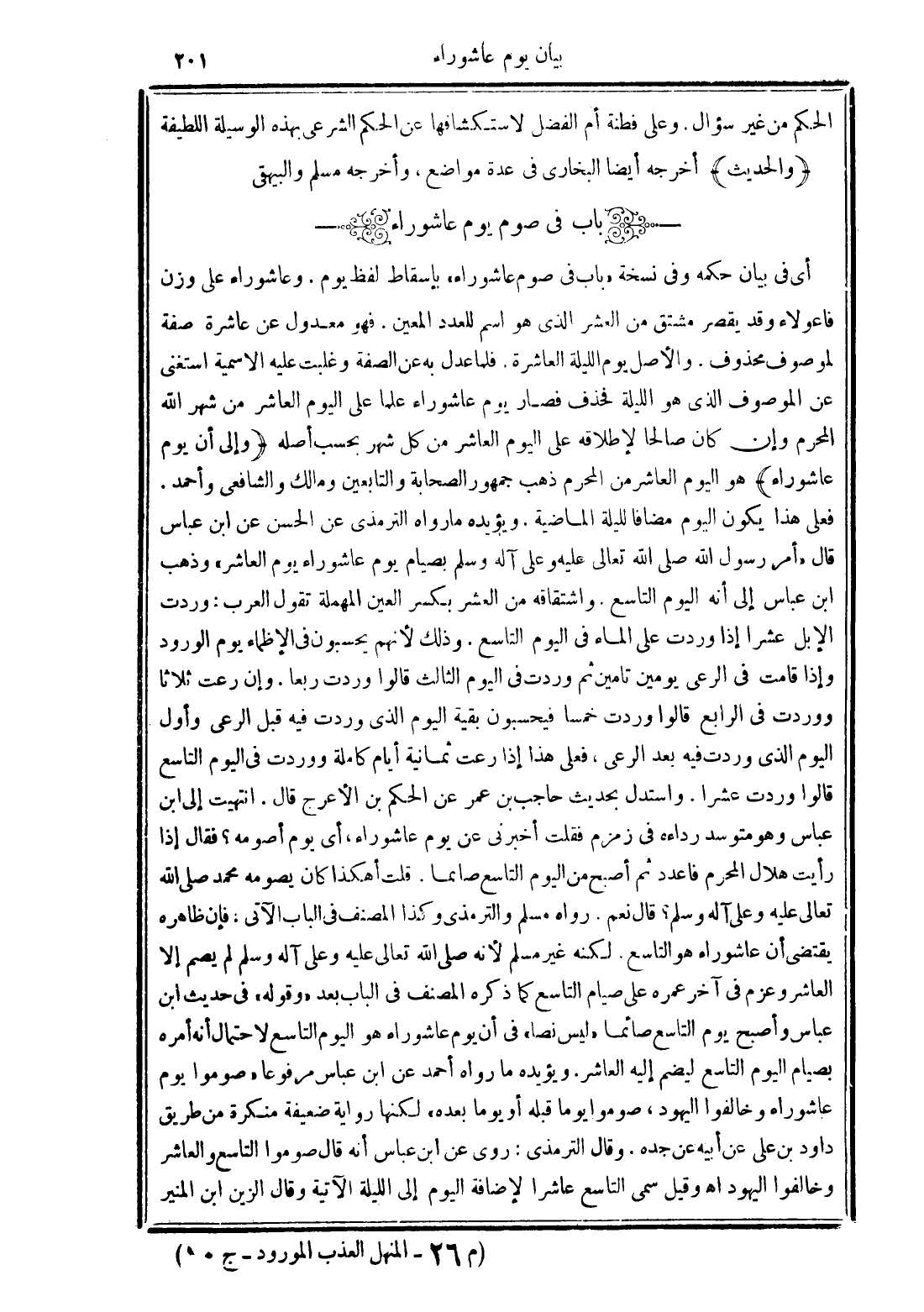 أى فى بيان حكمه وفى نسخة "باب في صوم عاشوراء" بإسقاط لفظ يوم. وعاشوراء على وزن فاعولاء وقد يقصر مشتق من العشر الذي هو اسم للعدد المعين. فهو معدول عن عاشرة صفة لموصوف محذوف. والأصل يوم الليلة العاشرة. فلما عدل به عن الصفة وغلبت عليه الاسمية استغنى عن الموصوف الذى هو الليلة فحذف فصار يوم عاشوراء علما على اليوم العاشر من شهر الله المحرم وإن كان صالحا لإطلاقه على اليوم العاشر من كل شهر بحسب أصله (وإلى أن يوم عاشوراء) هو اليوم العاشر من المحرم ذهب جمهور الصحابة والتابعين ومالك والشافعى وأحمد. فعلى هذا يكون اليوم مضافا لليلة الماضية. ويؤيده ما رواه الترمذى عن الحسن عن ابن عباس قال "أمر رسول الله صلى الله عليه وعلى آله وسلم بصيام يوم عاشوراء يوم العاشر" وذهب ابن عباس إلى أنه اليوم التاسع. واشتقاقه من العشر بكسر العين المهملة تقول العرب: وردت الإبل عشرا إذا ورد على الماء فى اليوم التاسع. وذلك لأنهم يحسبون في الإظماء يوم الورود وإذا قامت في الرعى يومين تامين ثم وردت فى اليوم الثالث قالوا وردت ربعا. وإن رعت ثلاثا ووردت في الرابع قالوا وردت خمسا فيحسبون بقية اليوم الذي وردت فيه قبل الرعى وأول اليوم الذي وردت فيه بعد الرعى، فعلى هذا إذا رعت ثمانية أيام كاملة ووردت في اليوم التاسع قالوا وردت عشرا. واستدل بحديث حاجب بن عمر عن الحكم بن الأعرج قال. انتهيت إلى ابن عباس وهو متوسد رداءه فى زمزم فقلت أخبرنى عن يوم عاشوراء، أي يوم أصومه؟ فقال إذا رأيت هلال المحرم فاعدد ثم أصبح من اليوم التاسع صائما. قلت أهكذا كان يصومه محمد صلى الله تعالى عليه وعلى آله وسلم؟ قال نعم. رواه والترمذى وكذا المصنف فى الباب الآتى: فإن ظاهره يقتضى أن عاشوراء هو التاسع. لكنه غير مسلم لأنه صلى الله تعالى عليه وعلى آله وسلم لم يصم إلا العاشر وعزم في آخر عمره على صيام التاسع كما ذكره المصنف في الباب بعد "وقوله" فى حديث ابن عباس وأصبح يوم التاسع صائما "ليس نصا" فى أن يوم عاشوراء هو اليوم التاسع لاحتمال أنه أمره بصيام اليوم التاسع ليضم إليه العاشر. ويؤيده ما رواه أحمد عن ابن عباس مرفوعا "صوموا يوم عاشوراء وخالفوا اليهود، صوموا يوما قبله أو يوما بعده" لكنها رواية ضعيفة منكرة من طريق داود بن على عن أبيه عن جده. وقال الترمذى: روى عن ابن عباس أنه قال صوموا التاسع والعاشر وخالفوا اليهود اهـ وقيل سمى التاسع عاشرا لإضافة اليوم إلى الليلة الآتية وقال الزين ابن المنير