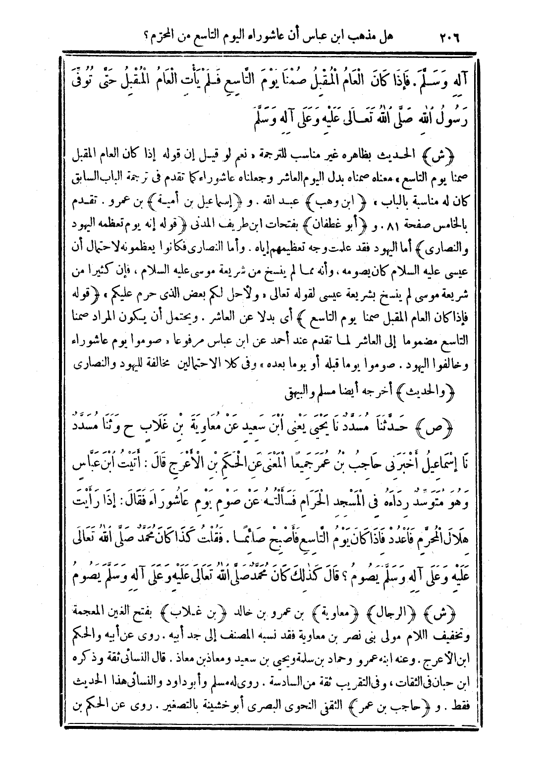 (ص) حَدَّثَنَا مُسَدَّدٌ نَا يَحْيَى يَعْنِى ابْنَ سَعِيدٍ عَنْ مُعَاوِيَةَ بْنِ غَلاَبٍ ح وَثَنَا مُسَدَّدٌ نَا إِسْمَاعِيلُ أَخْبَرَنِى حَاجِبُ بْنُ عُمَرَ جَمِيعًا الْمَعْنَى عَنِ الْحَكَمِ بْنِ الأَعْرَجِ قَالَ: أَتَيْتُ ابْنَ عَبَّاسٍ وَهُوَ مُتَوَسِّدٌ رِدَاءَهُ فِى الْمَسْجِدِ الْحَرَامِ فَسَأَلْتُهُ عَنْ صَوْمِ يَوْمِ عَاشُورَاءَ فَقَالَ: إِذَا رَأَيْتَ هِلاَلَ الْمُحَرَّمِ فَاعْدُدْ فَإِذَا كَانَ يَوْمُ التَّاسِعِ فَأَصْبِحْ صَائِمًا. فَقُلْتُ كَذَا كَانَ مُحَمَّدٌ صَلَّى اللَّهُ تَعَالَى عَلَيْهِ وَعَلَى آلِهِ وَسَلَّمَ يَصُومُ؟ قَالَ كَذَلِكَ كَانَ مُحَمَّدٌ صَلَّى اللَّهُ تَعَالَى عَلَيْهِ وَعَلَى آلِهِ وَسَلَّمَ يَصُومُ.