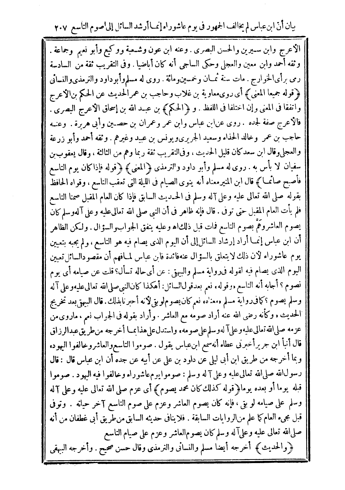 (قوله فإذا كان يوم التاسع فأصبح صائما) قال ابن المنير معناه أنه ينوى الصيام فى الليلة التى تعقب التاسع، وقواه الحافظ بقوله صلى الله تعالى عليه وعلى آله وسلم فى الحديث السابق فإذا كان العام المقبل صمنا التاسع فلم يأت العام المقبل حتى توفى. قال فإنه ظاهر فى أن النبي صلى الله تعالى عليه وعلى آله وسلم كان يصوم العاشر وهَمَّ بصوم التاسع فمات قبل ذلك اهـ وعليه يتفق الجواب والسؤال. ولكن الظاهر أن ابن عباس إنما أراد إرشاد السائل إلى أن اليوم الذي يصام فيه التاسع ولم يجبه بتعيين يوم عاشوراء لأن ذلك لا يتعلق بالسؤال عنه فائدة فابن عباس لما فهم أن مقصود السائل تعيين اليوم الذى يصام فيه لقوله فى رواية مسلم والبيهقى: عن أى حاله تسأل؟ قلت عن صيامه أى يوم نصوم؟ أجابه أنه التاسع "وقوله" نعم بعد قول السائل: أهكذا كان النبي صلى الله تعالى عليه وعلى آله وسلم يصوم؟ كما فى رواية مسلم "معناه" نعم كان يصوم لو بقى لأنه أخبرنا بذلك. قال البيهقى بعد تخرج الحديث "وكأنه رضى الله عنه أراد صومه مع العاشر. وأراد بقوله فى الجواب نعم، ما روى من عزمه صلى الله تعالى عليه وعلى آله وسلم على صومه" واستدل على هذا بما أخرجه من طريق عبد الرزاق قال أنبأ ابن جرير أخبرني عطاء أنه سمع ابن عباس يقول. صوموا التاسع والعاشر وخالفوا اليهود" وبما أخرجه من طريق ابن أبى ليلى عن داود بن على عن أبيه عن جده أن ابن عباس قال: قال رسول الله صلى الله تعالى عليه وعلى آله وسلم: صوموا يوم عاشوراء وخالفوا فيه اليهود. صوموا قبله يومًا أو بعده يومًا