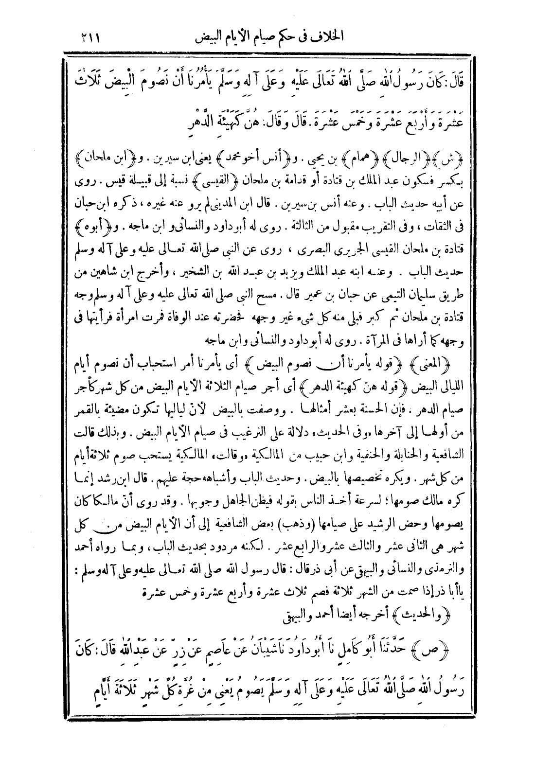 (قوله هنّ كهيئة الدهر) أى أجر صيام الثلاثة الأيام البيض من كل شهر كأجر صيام الدهر، فإن الحسنة بعشر أمثالها. ووصفت بالبيض لأنّ لياليها تكون مضيئة بالقمر من أولها إلى آخرها "وفي الحديث" دلالة على الترغيب في صيام الأيام البيض. وبذلك قالت الشافعية والحنابلة والحنفية وابن حبيب من المالكية "وقالت" المالكية يستحب صوم ثلاثة أيام من كل شهر. ويكره تخصيصها بالبيض. وحديث الباب وأشباهه حجة عليهم. قال ابن رشد إنما كره مالك صومها؛ لسرعة أخذ الناس بقوله فيظن الجاهل وجوبها. وقد روى أنّ مالكا كان يصومها وحض الرشيد على صيامها (وذهب) بعض الشافعية إلى أن الأيام البيض من كل شهر هي الثاني عشر والثالث عشر والرابع عشر. لكنه مردود بحديث الباب، وبما رواه أحمد والترمذي والنسائي والبيهقي عن أبي ذر قال: قال رسول الله صلى الله تعالى عليه وعلى آله وسلم: يا أبا ذر إذا صمت من الشهر ثلاثة فصم ثلاث عشرة وأربع عشرة وخمس عشرة.