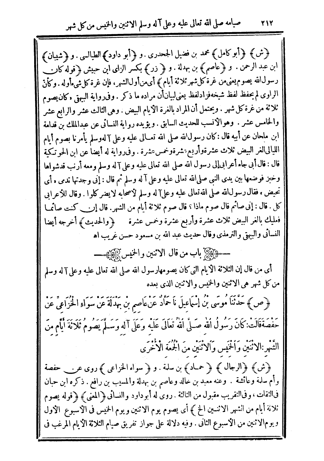(ص) حَدَّثَنَا مُوسَى بْنُ إِسْمَاعِيلَ نَا حَمَّادٌ عَنْ عَاصِمِ بْنِ بَهْدَلَةَ عَنْ سَوَاءٍ الْخُزَاعِىِّ عَنْ حَفْصَةَ قَالَتْ: كَانَ رَسُولُ اللَّهِ صَلَّى اللَّهُ تَعَالَى عَلَيْهِ وَعَلَى آلِهِ وَسَلَّمَ يَصُومُ ثَلاَثَةَ أَيَّامٍ مِنَ الشَّهْرِ: الاِثْنَيْنِ وَالْخَمِيسِ وَالاِثْنَيْنِ مِنَ الْجُمُعَةِ الأُخْرَى.