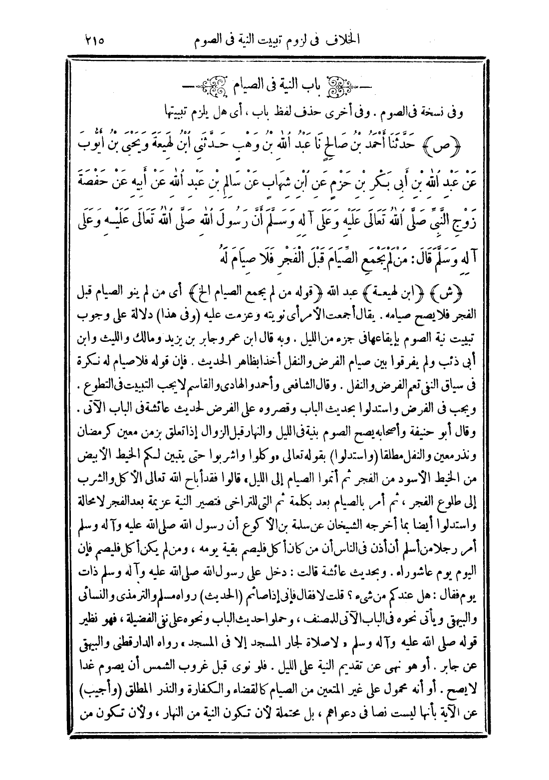 (ص) حَدَّثَنَا أَحْمَدُ بْنُ صَالِحٍ نَا عَبْدُ اللَّهِ بْنُ وَهْبٍ حَدَّثَنِى ابْنُ لَهِيعَةَ وَيَحْيَى بْنُ أَيُّوبَ عَنْ عَبْدِ اللَّهِ بْنِ أَبِى بَكْرِ بْنِ حَزْمٍ عَنِ ابْنِ شِهَابٍ عَنْ سَالِمِ بْنِ عَبْدِ اللَّهِ عَنْ أَبِيهِ عَنْ حَفْصَةَ زَوْجِ النَّبِىِّ صَلَّى اللَّهُ تَعَالَى عَلَيْهِ وَعَلَى آلِهِ وَسَلَّمَ أَنَّ رَسُولَ اللَّهِ صَلَّى اللَّهُ تَعَالَى عَلَيْهِ وَعَلَى آلِهِ وَسَلَّمَ قَالَ: مَنْ لَمْ يُجْمِعِ الصِّيَامَ قَبْلَ الْفَجْرِ فَلاَ صِيَامَ لَهُ.