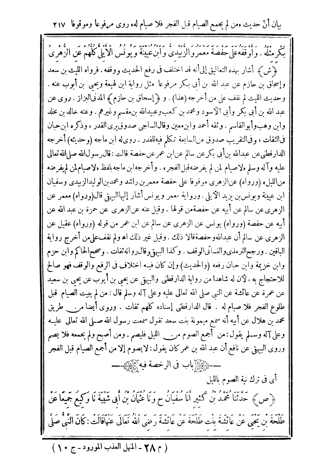 (ش) أشار بهذه التعاليق إلى أنه قد اختلف فى رفع الحديث ووقفه. فرواه الليث بن سعد وإسحاق بن حازم عن عبد الله بن أبى بكر مرفوعا مثل رواية ابن لهيعة ويحيى بن أيوب عنه. وحديث الليث لم نقف على من أخرجه (هذا). و (إسحاق بن حازم) المدنى البزاز. روى عن عبد الله بن أبى بكر وأبى الأسود ومحمد بن كعب وعبيد الله بن مقسم وغيرهم. وعنه خالد بن مخلد وابن وهب وأبو القاسم. وثقه أحمد وابن معين وقال الساجى صدوق يرى القدر، وذكره ابن حبان فى الثقات، وفى التقريب صدوق من السابعة تكلم فيه للقدر. روى له ابن ماجه (وحديثه) أخرجه الدارقطنى عن عبد الله بن أبى بكر عن سالم ابن عمر عن حفصة قالت: قال رسول الله صلى الله تعالى عليه وآله وسلم "لا صيام لمن لم يفرضه قبل الفجر". وأخرجه ابن ماجه بلفظ "لا صيام لمن لم يفرضه من الليل" (ورواه) عن الزهرى موقوفا على حفصة معمر بن راشد ومحمد بن الوليد الزبيدى وسفيان ابن عيينة ويونس بن يزيد الأيلى. ورواية معمر ويونس أشار إليها البيهقى قال (ورواه) معمر عن الزهرى عن سالم عن أبيه عن حفصة من قولها. وقيل عنه عن الزهرى عن حمزة بن عبد الله عن أبيه عن حفصة (ورواه) يونس عن الزهرى عن سالم عن ابن عمر من قوله (ورواه) عقيل عن الزهرى عن سالم أن عبد الله وحفصة قالا ذلك. وقيل غير ذلك اهـ ولم نقف على من أخرج رواية الباقين. ورجح الترمذى والنسائى الوقف. وكذا البيهقى وقال رواته ثقات. وصحح الحاكم وابن حزم وابن خزيمة وابن حبان رفعه (والحديث) وإن كان فيه اختلاف فى الرفع والوقف فهو صالح للاحتجاج به، لأن له شاهدا من رواية الدارقطنى والبيهقى عن يحيى بن أيوب عن يحيى بن سعيد عن عمرة عن عائشة عن النبي صلى الله تعالى عليه وعلى آله وسلم قال: من لم يبيت الصيام قبل طلوع الفجر فلا صيام له. قال الدارقطنى إسناده كلهم ثقات. وروى أيضا من طريق محمد بن هلال عن أبيه أنه سمع ميمونة بنت سعد تقول سمعت رسول الله صلى الله تعالى عليه وعلى آله وسلم يقول: من أجمع الصوم من الليل فليصم. ومن أصبح ولم يجمعه فلا يصم وروى البيهقى عن نافع أن عبد الله بن عمر كان يقول: لا يصوم إلا من أجمع الصيام قبل الفجر