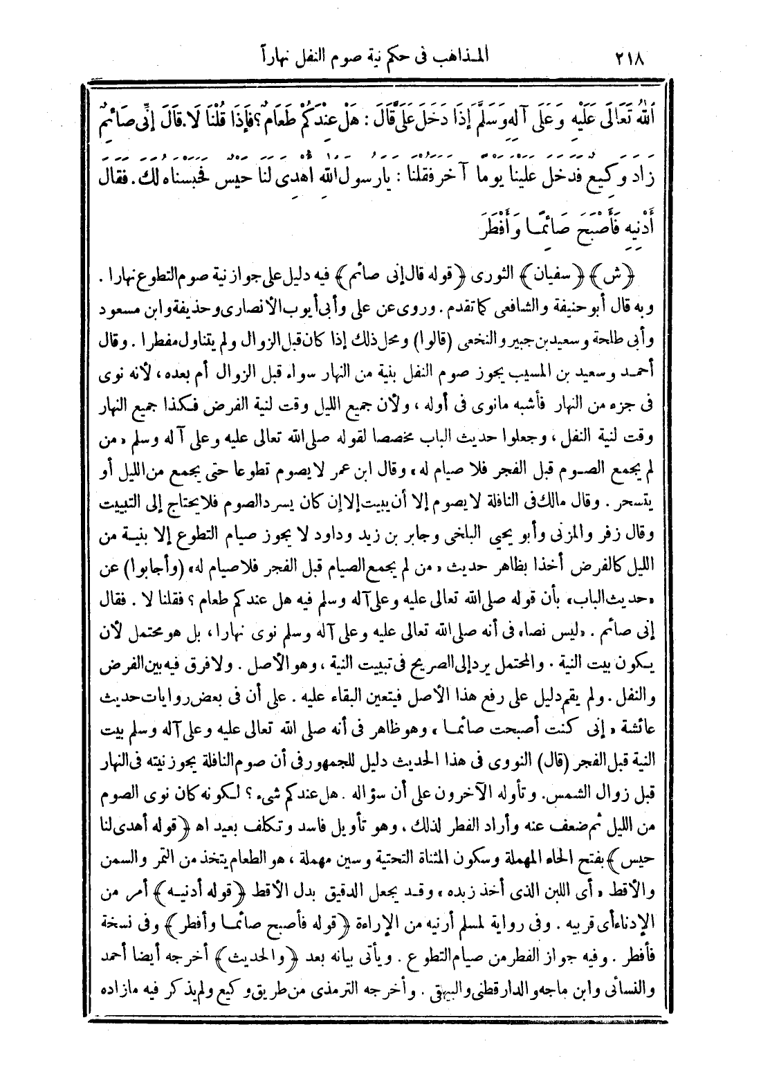 (قوله قال إنى صائم) فيه دليل على جواز نية صوم التطوع نهارا. وبه قال أبو حنيفة والشافعى كما تقدم. وروى عن على وأبى أيوب الأنصارى وحذيفة وابن مسعود وأبى طلحة وسعيد بن جبير والنخعى (قالوا) ومحل ذلك إذا كان قبل الزوال ولم يتناول مفطرا. وقال أحمد وسعيد بن المسيب يجوز صوم النفل بنية من النهار سواء قبل الزوال أم بعده، لأنه نوى فى جزء من النهار فأشبه ما نوى فى أوله، ولأن جميع الليل وقت لنية الفرض فكذا جميع النهار وقت لنية النفل، وجعلوا حديث الباب مخصصا لقوله صلى الله تعالى عليه وعلى آله وسلم "من لم يجمع الصوم قبل الفجر فلا صيام له" وقال ابن عمر لا يصوم تطوعا حتى يجمع من الليل أو يتسحر. وقال مالك فى النافلة لا يصوم إلا أن يبيت إلا إن كان يسرد الصوم فلا يحتاج إلى التبييت وقال زفر والمزنى وأبو يحيى البلخى وجابر بن زيد وداود لا يجوز صيام التطوع إلا بنية من الليل كالفرض أخذا بظاهر حديث "من لم يجمع الصيام قبل الفجر فلا صيام له" (وأجابوا) عن "حديث الباب" بأن قوله صلى الله تعالى عليه وعلى آله وسلم فيه هل عندكم طعام؟ فقلنا لا. فقال إنى صائم. "ليس نصا" فى أنه صلى الله تعالى عليه وعلى آله وسلم نوى نهارا، بل هو محتمل لأن يكون بيت النية. والمحتمل يرد إلى الصريح فى تبييت النية، وهو الأصل. ولا فرق في بين الفرض والنفل. ولم يقم دليل على رفع هذا الأصل فيتعين البقاء عليه. على أن فى بعض روايات حديث عائشة "إنى كنت أصبحت صائما" وهو ظاهر فى أنه صلى الله تعالى عليه وعلى آله وسلم بيت النية قبل الفجر (قال) النووى فى هذا الحديث دليل للجمهور فى أن صوم النافلة يجوز نيته فى النهار قبل زوال الشمس. وتأوله الآخرون على أن سؤاله. هل عندكم شيء؟ لكونه كان نوى الصوم من الليل ثم ضعف عنه وأراد الفطر لذلك، وهو تأويل فاسد وتكلف بعيد اهـ