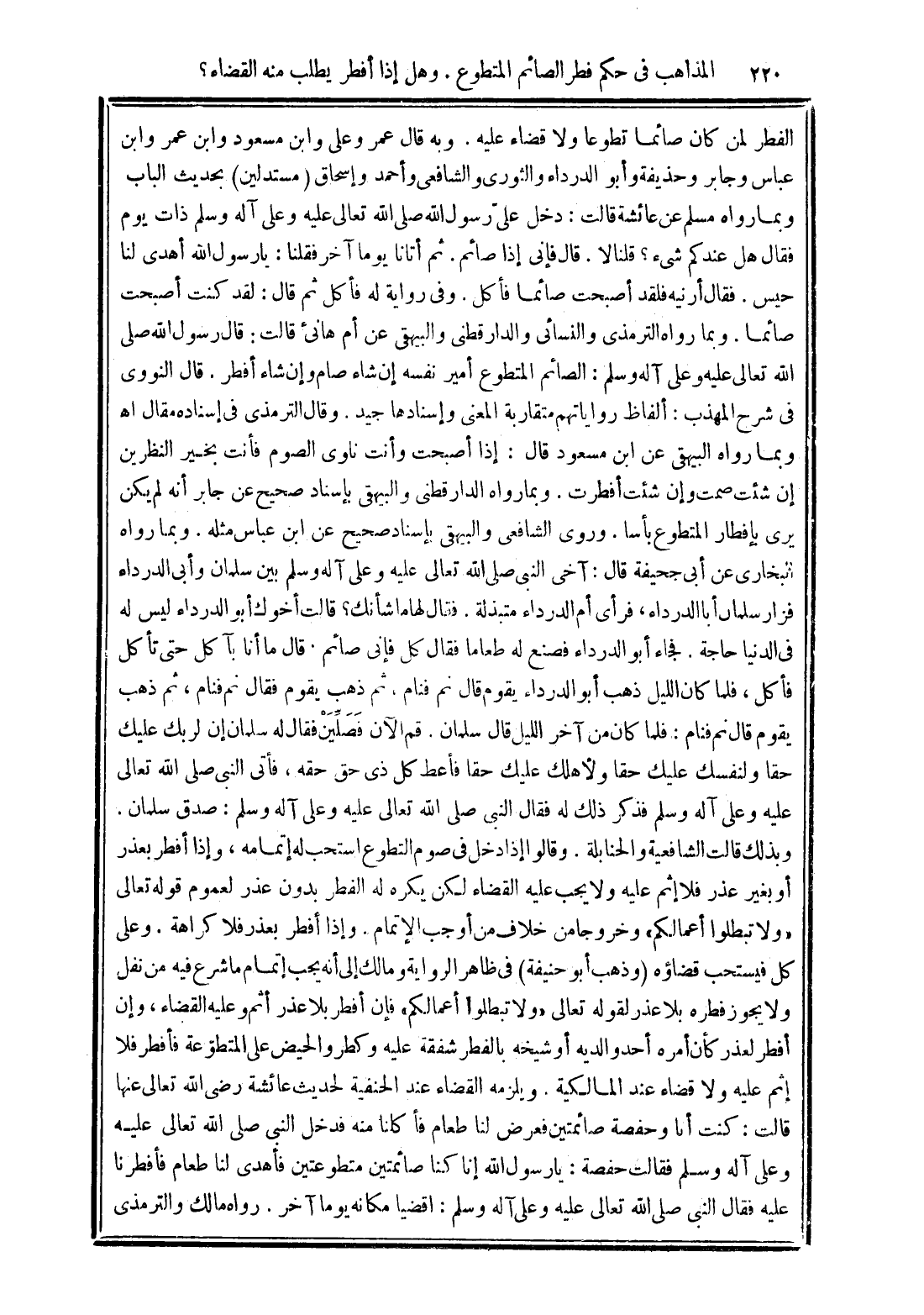 الفطر لمن كان صائما تطوعا ولا قضاء عليه. وبه قال عمر وعلى وابن مسعود وابن عمر وابن عباس وجابر وحذيفة وأبو الدرداء والثورى والشافعى وأحمد وإسحاق (مستدلين) بحديث الباب وبما رواه مسلم عن عائشة قالت: دخل علىّ رسول الله صلى الله تعالى عليه وعلى آله وسلم ذات يوم فقال هل عندكم شئ؟ قلنا لا. قال فإنى إذا صائم. ثم أتانا يوما آخر فقلنا: يا رسول الله أهدى لنا حيس. فقال أرنيه فلقد أصبحت صائما فأكل. وفى رواية له فأكل ثم قال: لقد كنت أصبحت صائما. وبما رواه الترمذى والنسائى والدارقطنى والبيهقى عن أم هانئ قالت: قال رسول الله صلى الله تعالى عليه وعلى آله وسلم: الصائم المتطوع أمير نفسه إن شاء صام وإن شاء أفطر. قال النووى فى شرح المهذب: ألفاظ رواياتهم متقاربة المعنى وإسنادها جيد. وقال الترمذى فى إسناده مقال اهـ وبما رواه البيهقى عن ابن مسعود قال: إذا أصبحت وأنت ناوى الصوم فأنت بخير النظرين إن شئت صمت وإن شئت أفطرت. وبما رواه الدارقطنى والبيهقى بإسناد صحيح عن جابر أنه لم يكن يرى بإفطار المتطوع بأسا. وروى الشافعى والبيهقى بإسناد صحيح عن ابن عباس مثله. وبما رواه البخارى عن أبى جحيفة قال: آخى النبى صلى الله تعالى عليه وعلى آله وسلم بين سلمان وأبى الدرداء فزار سلمان أبا الدرداء، فرأى أم الدرداء متبذلة. فقال لها ما شأنك؟ قالت أخوك أبو الدرداء ليس له فى الدنيا حاجة. فجاء أبو الدرداء فصنع له طعاما فقال كل فإنى صائم. قال ما أنا بآكل حتى تأكل فأكل، فلما كان الليل ذهب أبو الدرداء يقوم قال نم فنام، ثم ذهب يقوم فقال نم فنام، ثم ذهب يقوم قال نم فنام: فلما كان من آخر الليل قال سلمان. قم الآن فَصَلِّيَنْ فقال له سلمان إن لربك عليك حقا ولنفسك عليك حقا ولأهلك عليك حقا فأعط كل ذى حق حقه، فأتى النبى صلى الله تعالى عليه وعلى آله وسلم فذكر ذلك له فقال النبى صلى الله تعالى عليه وعلى آله وسلم: صدق سلمان. وبذلك قالت الشافعية والحنابلة. وقالوا إذا دخل فى صوم التطوع استحب له إتمامه، وإذا أفطر بعذر أو بغير عذر فلا إثم عليه ولا يجب عليه القضاء لكن يكره له الفطر بدون عذر لعموم قوله تعالى {وَلَا تُبْطِلُوا أَعْمَالَكُمْ} وخروجا من خلاف من أوجب الإتمام. وإذا أفطر بعذر فلا كراهة. وعلى كل فيستحب قضاؤه (وذهب أبو حنيفة) فى ظاهر الرواية ومالك إلى أنه يجب إتمام ما شرع فيه من نفل ولا يجوز فطره بلا عذر لقوله تعالى {وَلَا تُبْطِلُوا أَعْمَالَكُمْ} فإن أفطر بلا عذر أثم وعليه القضاء، وإن أفطر لعذر كأن أمره أحد والديه أو شيخه بالفطر شفقة عليه وكطرو الحيض على المتطوعة فأفطر فلا إثم عليه ولا قضاء عند المالكية. ويلزمه القضاء عند الحنفية لحديث عائشة رضى الله تعالى عنها قالت: كنت أنا وحفصة صائمتين فعرض لنا طعام فأكلنا منه فدخل النبى صلى الله تعالى عليه وعلى آله وسلم فقالت حفصة: يا رسول الله إنا كنا صائمتين متطوعتين فأهدى لنا طعام فأفطرنا عليه فقال النبى صلى الله تعالى عليه وعلى آله وسلم: اقضيا مكانه يوما آخر. رواه مالك والترمذى