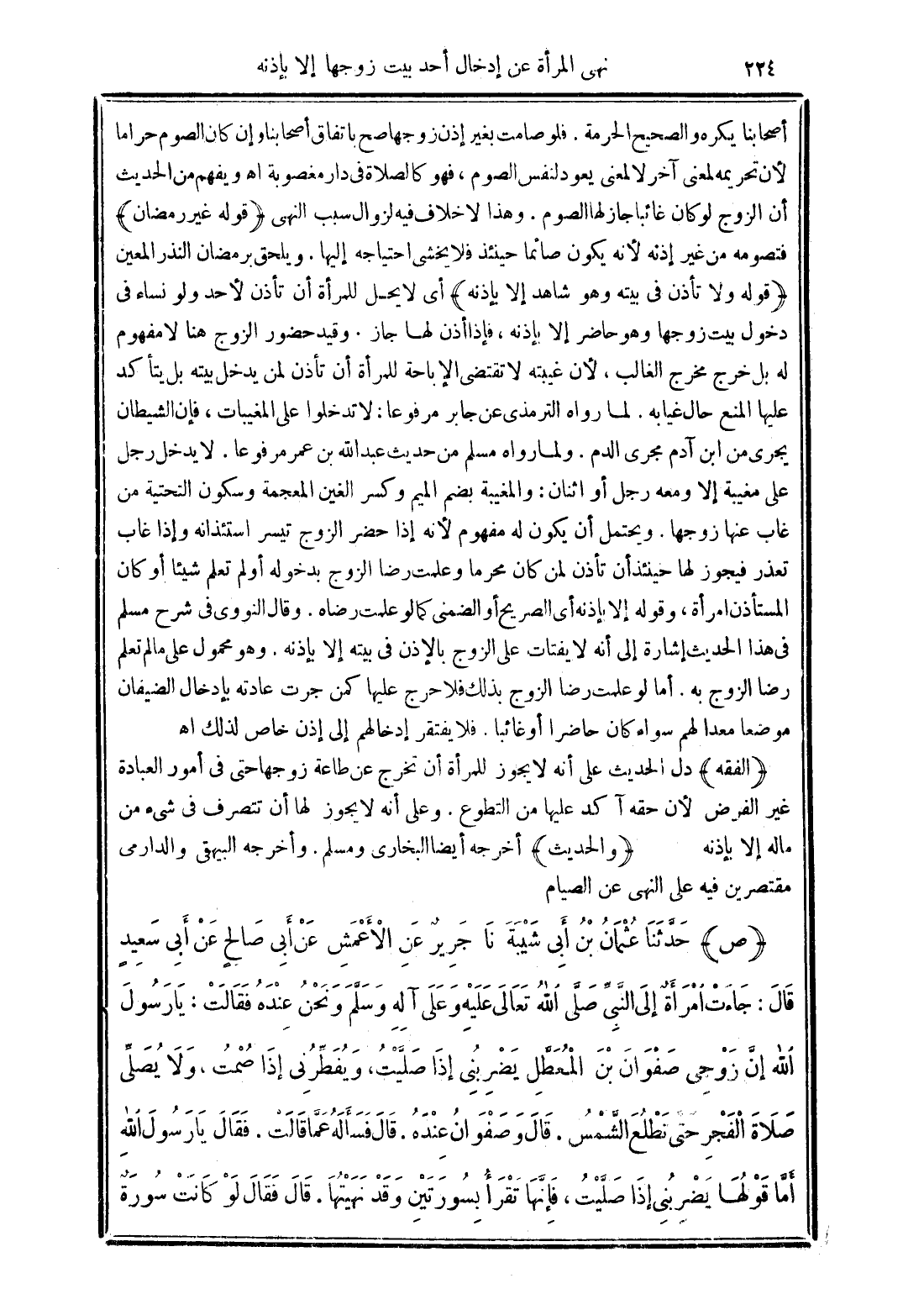 (الفقه) دل الحديث على أنه لا يجوز للمرأة أن تخرج عن طاعة زوجها حتى فى أمور العبادة غير الفرض لأن حقه آكد عليها من التطوع. وعلى أنه لا يجوز لها أن تتصرف فى شيء من ماله إلا بإذنه. (والحديث) أخرجه أيضا البخارى ومسلم. وأخرجه البيهقى والدارمى مقتصرين فيه على النهى عن الصيام