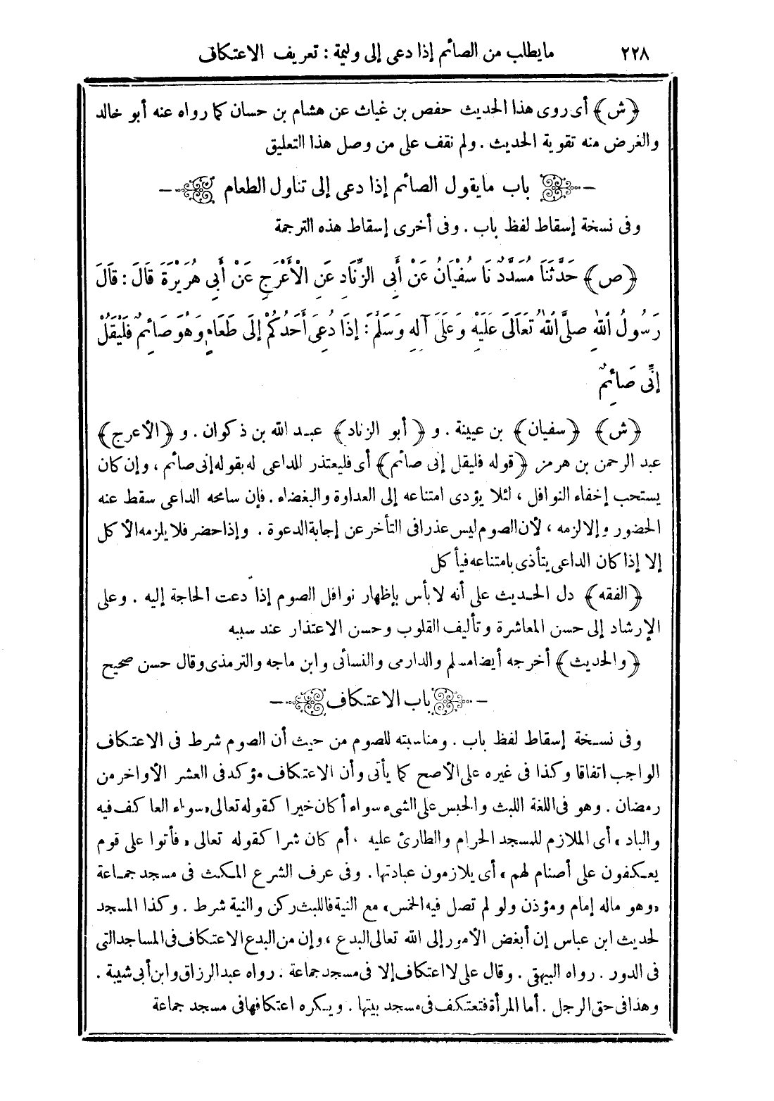وفى نسخة إسقاط لفظ باب. ومناسبته للصوم من حيث أن الصوم شرط من شروط الاعتكاف الواجب اتفاقا وكذا فى غيره على الأصح كما يأتى وأن الاعتكاف مؤكد فى العشر الأواخر من رمضان وهو فى اللغة اللبث والحبس على الشيء سواء أكان خيرا كقوله تعالى {سَوَاءً الْعَاكِفُ فِيهِ وَالْبَادِ} أى الملازم للمسجد الحرام والطارئ عليه، أم كان شرا كقوله تعالى {فَأَتَوْا عَلَى قَوْمٍ يَعْكُفُونَ عَلَى أَصْنَامٍ لَهُمْ} أى يلازمون عبادتها. وفى عرف الشرع المكث فى مسجد جماعة "وهو ما له إمام ومؤذن ولو لم تصل فيه الخمس" مع النية فاللبث ركن والنية شرط. وكذا المسجد لحديث ابن عباس أن أبغض الأمور إلى الله تعالى البدع، وإن من البدع الاعتكاف فى المساجد التي فى الدور. رواه البيهقى. وقال على الاعتكاف إلا فى مسجد جماعة رواه عبد الرزاق وابن أبى شيبة. وهذا فى حق الرجل. أما المرأة فتعتكف فى مسجد بيتها. ويكره اعتكافها فى مسجد جماعة