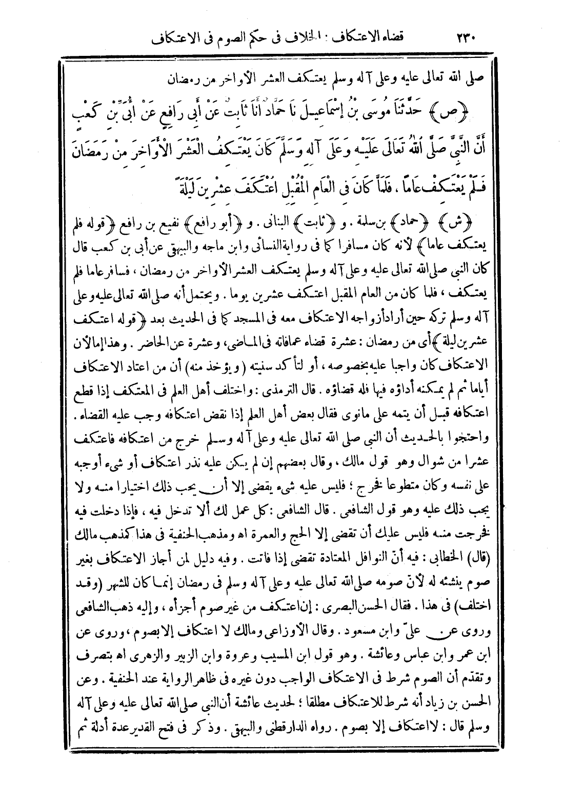 (ص) حَدَّثَنَا مُوسَى بْنُ إِسْمَاعِيلَ نَا حَمَّادٌ أَنَا ثَابِتٌ عَنْ أَبِى رَافِعٍ عَنْ أُبَىِّ بْنِ كَعْبٍ أَنَّ النَّبِىَّ صَلَّى اللَّهُ تَعَالَى عَلَيْهِ وَعَلَى آلِهِ وَسَلَّمَ كَانَ يَعْتَكِفُ الْعَشْرَ الأَوَاخِرَ مِنْ رَمَضَانَ فَلَمْ يَعْتَكِفْ عَامًا, فَلَمَّا كَانَ الْعَامُ الْمُقْبِلُ اعْتَكَفَ عِشْرِينَ لَيْلَةً.