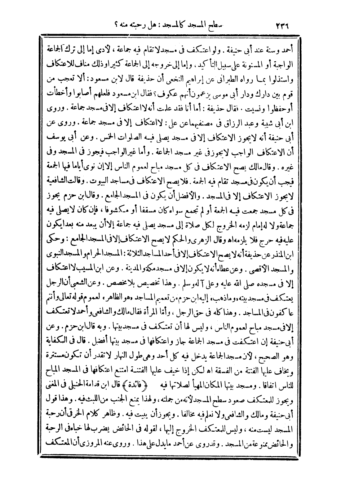 أحمد وسنة عند أبى حنيفة. ولو اعتكف فى المسجد لا تقام فيه جماعة, لأدى إما إلى ترك الجماعة الواجبة أو المسنونة على سبيل التأكيد, وإما إلى خروجه إلى الجماعة كثيرا وذلك مناف للاعتكاف واستدلوا بما رواه الطبرانى عن إبراهيم النخعى أن حذيفة قال لابن مسعود: ألا تعجب من قوم بين دارك ودار أبى موسى يزعمون أنهم عكوف؟ فقال ابن مسعود فلعلهم أصابوا وأخطأت أو حفظوا ونسيت. فقال حذيفة: أما أنا فقد علمت أنه لا اعتكاف إلا فى مسجد جماعة. وروى ابن أبى شيبة وعبد الرزاق فى مصنفيهما عن على: لا اعتكاف إلا فى مسجد جماعة. وروى عن أبى حنيفة أنه لا يجوز الاعتكاف إلا فى مسجد يصلى فيه الصلوات الخمس. وعن أبى يوسف أن الاعتكاف الواجب لا يجوز فى غير مسجد جماعة. وأما غير الواجب فيجوز فى المسجد وفى غيره. وقال مالك يصح الاعتكاف فى كل مسجد مباح لعموم الناس إلا إن نوى أياما فيها الجمعة فيجب أن يكون فى مسجد تقام فيه الجمعة. فلا يصح الاعتكاف فى مساجد البيوت. وقالت الشافعية لا يجوز الاعتكاف إلا فى المسجد. والأفضل أن يكون فى المسجد الجامع. وقال ابن حزم يجوز فى كل مسجد جمعت فيه الجمعة أو لم تجمع سواء كان مسقفا أو مكشوفا, فإن كان لا يصلى فيه جماعة ولا له إمام لزمه الخروج لكل صلاة إلى مسجد يصلى فيه جماعة إلا أن يبعد منه بعدا يكون عليه فيه حرج فلا يلزمه اهـ وقال الزهرى والحكم لا يصح الاعتكاف إلا فى المسجد الجامع: وحكى ابن المنذر عن حذيفة أنه لا يصح الاعتكاف إلا فى أحد المساجد الثلاثة: المسجد الحرام والمسجد النبوى والمسجد الأقصى. وعن عطاء أنه لا يكون إلا فى مسجد مكة والمدينة. وعن ابن المسيب لا اعتكاف إلا فى مسجده صلى الله عليه وعلى آله وسلم. وهذا تخصيص بلا مخصص. وعن الشعبى أن الرجل يعتكف فى مسجد بيته "وما ذهب" إليه ابن حزم من تعميم المساجد "هو الظاهر" لعموم قوله تعالى {وَأَنْتُمْ عَاكِفُونَ فِي الْمَسَاجِدِ}. وهذا كله فى حق الرجل, وأمّا المرأة فقال مالك والشافعى وأحمد لا تعتكف إلا فى مسجد مباح لعموم الناس, وليس لها أن تعتكف فى مسجد بيتها. وبه قال ابن حزم. وعن أبى حنيفة إن اعتكفت فى مسجد الجماعة جاز واعتكافها فى مسجد بيتها أفضل. قال فى الكفاية وهو الصحيح, لأن مسجد الجماعة يدخل فيه كل أحد وهى طول النهار لا تقدر أن تكون مستترة ويخاف عليها الفتنة من الفسقة اهـ لكن إذا خيف عليها الفتنة امتنع اعتكافها فى المسجد المباح للناس اتفاقا. ومسجد بيتها المكان المهيأ لصلاتها فيه (فائدة) قال ابن قدامة الحنبلى فى المغنى ويجوز للمعتكف صعود سطح المسجد لأنه من جملته, ولهذا يمنع الجنب من اللبث فيه. وهذا قول أبى حنيفة ومالك والشافعى ولا نعلم فيه مخالفا. ويجوز أن يبيت فيه. وظاهر كلام الخرقى أن رحبة المسجد ليست منه, وليس للمعتكف الخروج إليها, لقوله فى الحائض يضرب لها خباء فى الرحبة والحائض ممنوعة من المسجد. وقد روى عن أحمد ما يدل على هذا, وروى عنه المروزى أن المعتكف