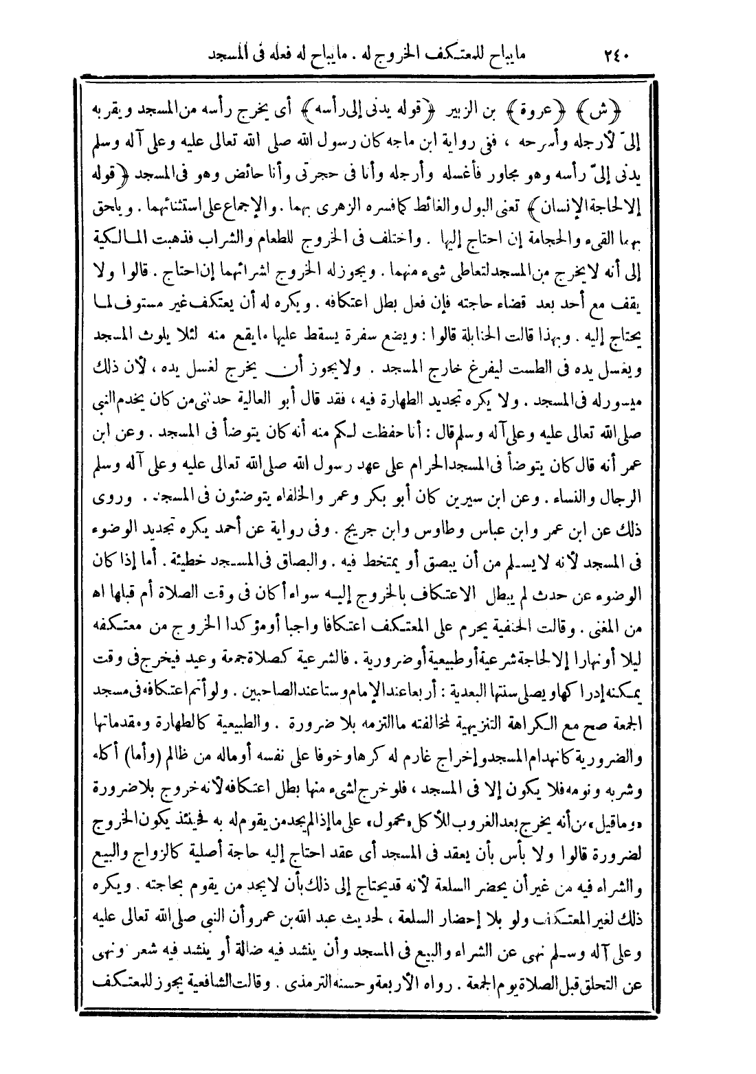 (قوله إلا لحاجة الإنسان) تعنى البول والغائط كما فسره الزهرى بهما. والإجماع على استثنائهما. ويلحق بهما القئ والحجامة إن احتاج إليها. واختلف فى الخروج للطعام والشراب فذهبت المالكية إلى أنه لا يخرج من المسجد لتعاطى شيء منهما. ويجوز له الخروج لشرائهما إن احتاج. قالوا ولا يقف مع أحد بعد قضاء حاجته فإن فعل بطل اعتكافه. ويكره له أن يعتكف غير مستوف لما يحتاج إليه. وبهذا قالت الحنابلة قالوا: ويضع سفرة يسقط عليها ما يقع منه لئلا يلوث المسجد ويغسل يده فى الطست ليفرغ خارج المسجد. ولا يجوز أن يخرج لغسل يده, لأن ذلك ميسور له فى المسجد. ولا يكره تجديد الطهارة فيه, فقد قال أبو العالية حدثنى من كان يخدم النبى صلى الله عليه وعلى آله وسلم قال: أنا حفظت لكم منه أنه كان يتوضأ فى المسجد. وعن ابن عمر أنه قال كان يتوضأ فى المسجد الحرام على عهد رسول الله صلى الله عليه وعلى آله وسلم الرجال والنساء. وعن ابن سيرين كان أبو بكر وعمر والخلفاء يتوضئون فى المسجد. وروى ذلك عن ابن عمر وابن عباس وطاوس وابن جريج. وفى رواية عن أحمد يكره تجديد الوضوء فى المسجد لأنه لا يسلم من أن يبصق أو يتمخط فيه. والبصاق فى المسجد خطيئة. أما إذا كان الوضوء عن حدث لم يبطل الاعتكاف بالخروج إليه سواء أكان فى وقت الصلاة أم قبلها اهـ من المغنى. وقالت الحنفية يحرم على المعتكف اعتكافا واجبا أو مؤكدا الخروج من معتكفه ليلا أو نهارا إلا لحاجة شرعية أو طبيعية أو ضرورية. فالشرعية كصلاة جمعة وعيد فيخرج فى وقت يمكنه إدراكها ويصلى سنتها البعدية: أربعا عند الإمام وستا عند الصاحبين. ولو أتم اعتكافه فى مسجد الجمعة صح مع الكراهة التنزيهية لمخالفته ما التزمه بلا ضرورة. والطبيعية كالطهارة ومقدماتها والضرورية كانهدام المسجد وإخراج غارم له كرها وخوفا على نفسه أو ماله من ظالم (وأما) أكله وشربه ونومه فلا يكون إلا فى المسجد, فلو خرج لشيء منها بطل اعتكافه لأنه خروج بلا ضرورة "وما قيل" من أنه يخرج بعد الغروب للأكل "محمول" على ما إذا لم يجد من يقوم له به فحينئذ يكون الخروج لضرورة قالوا ولا بأس بأن يعقد فى المسجد أى عقد احتاج إليه حاجة أصلية كالزواج والبيع والشراء فيه من غير أن يحضر السلعة لأنه قد يحتاج إلى ذلك بأن لا يجد من يقوم بحاجته. ويكره ذلك لغير المعتكف ولو بلا إحضار السلعة, لحديث عبد الله بن عمرو أن النبى صلى الله عليه وعلى آله وسلم نهى عن الشراء والبيع فى المسجد وأن ينشد فيه ضالة أو ينشد فيه شعر ونهى عن التحلق قبل الصلاة يوم الجمعة. رواه الأربعة وحسنه الترمذى. وقالت الشافعية يجوز للمعتكف