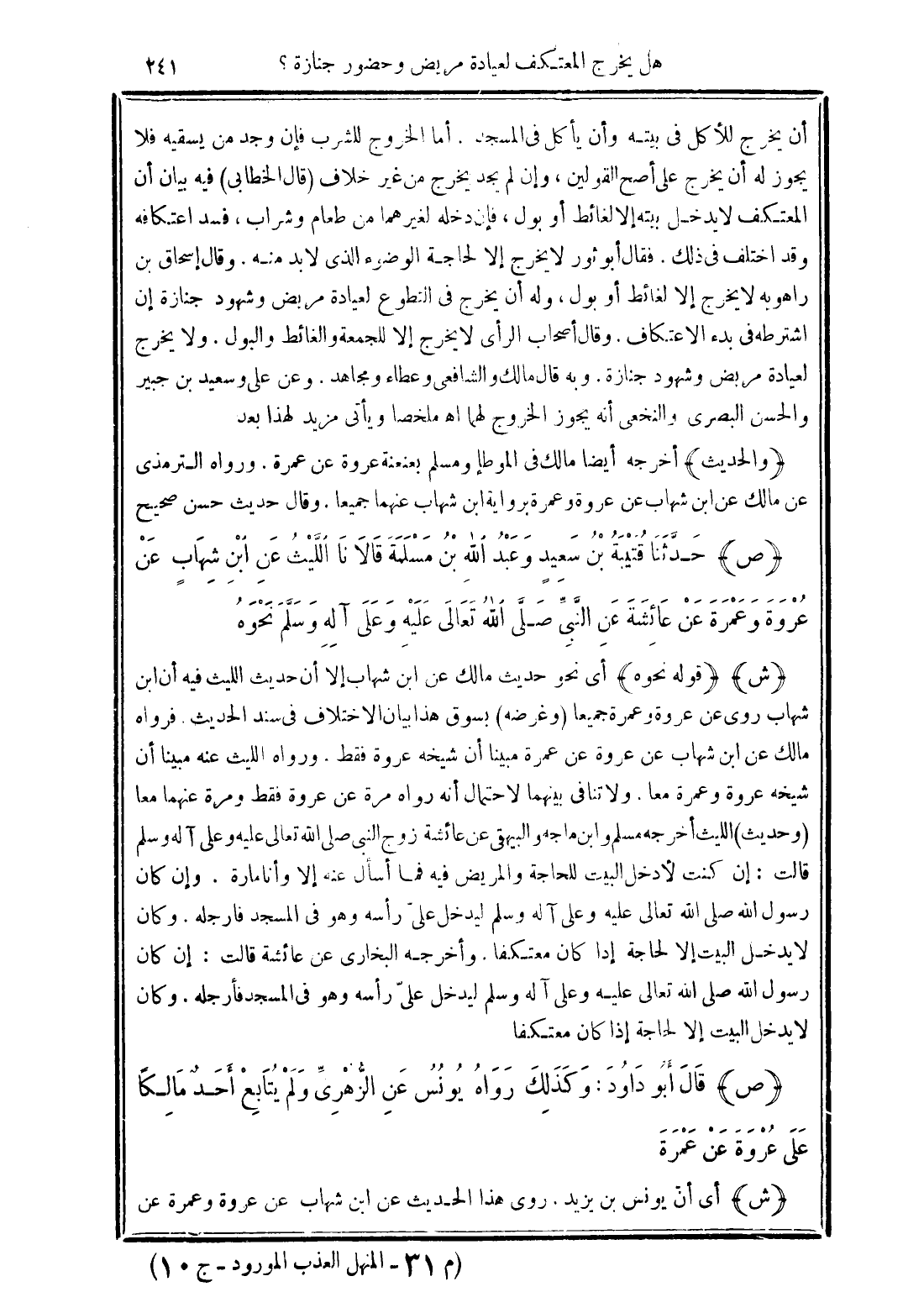 أن يخرج للأكل في بيته وأن يأكل في المسجد. أما الخروج للشرب فإن وجد من يسقيه فلا يجوز له أن يخرج على أصح القولين, وإن لم يجد يخرج من غير خلاف (قال الخطابي) فيه بيان أن المعتكف لا يدخل بيته إلا لغائط أو بول, فإن دخله لغيرهما من طعام وشراب, فسد اعتكافه وقد اختلف في ذلك. فقال أبو ثور لا يخرج إلا لحاجة الوضوء الذي لا بد منه. وقال إسحاق بن راهويه لا يخرج إلا لغائط أو بول, وله أن يخرج في التطوع لعيادة مريض وشهود جنازة إن اشترطه في بدء الاعتكاف. وقال أصحاب الرأي لا يخرج إلا للجمعة والغائط والبول. ولا يخرج لعيادة مريض وشهود جنازة. وبه قال مالك والشافعي وعطاء ومجاهد. وعن على وسعيد بن جبير والحسن البصري والنخعي أن يجوز الخروج لهما اهـ ملخصا ويأتي مزيد لهذا بعد