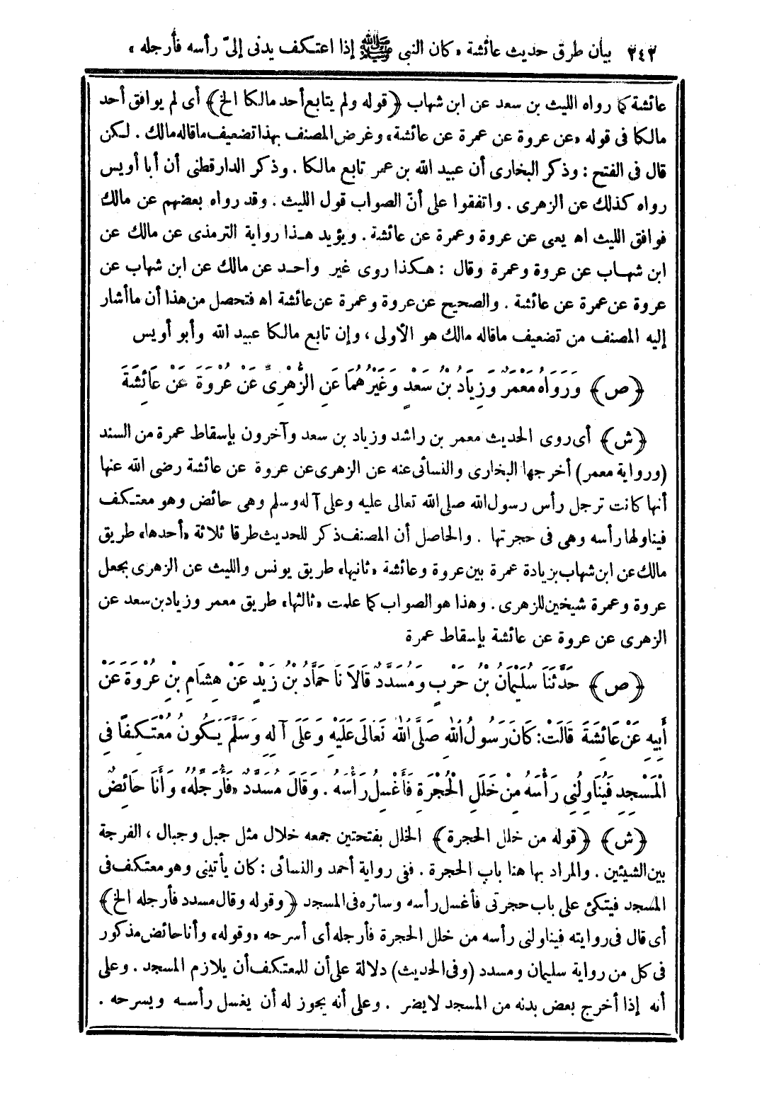(ص) حَدَّثَنَا سُلَيْمَانُ بْنُ حَرْبٍ وَمُسَدَّدٌ قَالاَ نَا حَمَّادُ بْنُ زَيْدٍ عَنْ هِشَامِ بْنِ عُرْوَةَ عَنْ أَبِيهِ عَنْ عَائِشَةَ قَالَتْ: كَانَ رَسُولُ اللَّهِ صَلَّى اللَّهُ تَعَالَى عَلَيْهِ وَعَلَى آلِهِ وَسَلَّمَ يَكُونُ مُعْتَكِفًا فِى الْمَسْجِدِ فَيُنَاوِلُنِى رَأْسَهُ مِنْ خَلَلِ الْحُجْرَةِ فَأَغْسِلُ رَأْسَهُ. وَقَالَ مُسَدَّدٌ "فَأُرَجِّلُهُ" وَأَنَا حَائِضٌ.