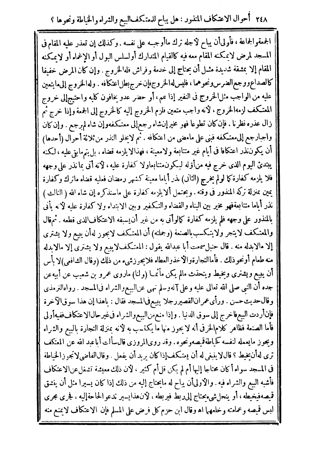 الجمعة والجماعة، فأولى أن يباح لأجله ترك ما أوجبه على نفسه. وكذلك إن تعذر عليه المقام في المسجد لمرض لا يمكنه المقام معه فيه كالقيام المتدارك أو لسلس البول أو الإغماء أو لا يمكنه المقام إلا بمشقة شديدة مثل أن يحتاج إلى خدمة وفراش فله الخروج. وإن كان المرض خفيفا كالصداع ووجع الضرس ونحوهما، فليس له الخروج فإن خرج بطل اعتكافه. وله الخروج إلى ما يتعين عليه من الواجب مثل الخروج في النفير إذا عم، أو حضر عدو يخافون كلبه واحتيج إلى خروج المعتكف لزمه الخروج، لأنه واجب متعين فلزم الخروج إليه كالخروج إلى الجمعة وإذا خرج ثم زال عذره نظرنا. فإن كان تطوعا فهو مخير إن شاء رجع إلى معتكفه وإن شاء لم يرجع. وإن كان واجبًا رجع إلى معتكفه فبنى على ما مضى من اعتكافه. ثم لا يخلو النذر من ثلاثة أحوال (أحدها) أن يكون نذر اعتكافًا في أيام غير متتابعة ولا معينة، فهذا لا يلزمه قضاء، بل يتم ما بقى عليه، لكنه يبتدئ اليوم الذى خرج فيه من أوّله ليكون متتابعا ولا كفارة عليه، لأنه أتى بما نذر على وجهه فلا يلزمه كفارة كما لو لم يخرج (الثاني) نذر أياما معينة كشهر رمضان فعليه قضاء ما ترك وكفارة يمين بمنزلة تركه المنذور في وقته. ويحتمل ألا يلزمه كفارة على ما سنذكره إن شاء الله (الثالث) نذر أياما متتابعة فهو مخير بين البناء والقضاء والتكفير وبين الابتداء ولا كفارة عليه لأنه يأتى بالمنذور على وجهه فلم يلزمه كفارة كما لو أتى به من غير أن يسبقه الاعتكاف الذى قطعه. ثم قال والمعتكف لا يتجر ولا يتكسب بالصنعة (وجملته) أن المعتكف لا يجوز له أن يبيع ولا يشترى إلا ما لا بد له منه. قال حنبل سمعت أبا عبد الله يقول: المعتكف لا يبيع ولا يشترى إلا ما لا بد له منه طعام أو نحو ذلك. فأما التجارة والأخذ والعطاء فلا يجوز شئ من ذلك (وقال الشافعى) لا بأس أن يبيع ويشترى ويخيط ويتحدّث ما لم يكن مأثما (ولنا) ما روى عمرو بن شعيب عن أبيه عن جده أن النبي صلى الله تعالى عليه وعلى آله وسلم نهى عن البيع والشراء في المسجد. رواه الترمذى وقال حديث حسن. ورأى عمران القصير رجلا يبيع في المسجد فقال: ياهذا إن هذا سوق الآخرة فإن أردت البيع فاخرج إلى سوق الدنيا. وإذا منع من البيع والشراء في غير حال الاعتكاف ففي أولى فأما الصنعة فظاهر كلام الخرقى أنه لا يجوز منها ما يكتسب به لأنه بمنزلة التجارة بالبيع والشراء ويجوز ما يعمله لنفسه كخياطة قميصه ونحوه. وقد روى المروزي قال سألت أبا عبد الله عن المعتكف ترى له أن يخيط؟ قال لا ينبغى له أن يعتكف إذا كان يريد أن يفعل. وقال القاضى لا تجوز الخياطة في المسجد سواء أكان محتاجًا إليها أم لم يكن قل أم كثير، لأن ذلك معيشة تشغل عن الاعتكاف فأشبه البيع والشراء فيه. والأولى أن يباح له ما يحتاج إليه من ذلك إذا كان يسيرا مثل أن ينشق قميصه فيخيطه، أو ينحل شئ يحتاج إلى ربط فيربطه، لأن هذا يسير تدعو الحاجة إليه، فجرى مجرى لبس قميصه وعمامته وخلعهما اهـ وقال ابن حزم كل فرض على المسلم فإن الاعتكاف لا يمنع منه