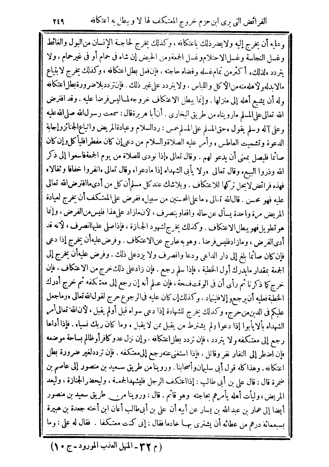 وعليه أن يخرج إليه ولا يضر ذلك باعتكافه، وكذلك يخرج لحاجة الإنسان من البول والغائط وغسل النجاسة وغسل الاحتلام وغسل الجمعة ومن الحيض إن شاء في حمام أو في غير حمام، ولا يتردد "لذلك" أكثر من تمام غسله وقضاء حاجته، فإن فعل بطل اعتكافه، وكذلك يخرج لابتياع ما لا بد له ولأهله منه من الأكل واللباس، ولا يتردد على غير ذلك. فإن تردد بلا ضرورة بطل اعتكافه وله أن يشيع أهله إلى منزلها. وإنما يبطل الاعتكاف خروجه لما ليس فرضا عليه. وقد افترض الله تعالى على المسلم ما رويناه من طريق البخارى. أن أباهريرة قال: سمعت رسول الله صلى الله عليه وعلى آله وسلم يقول "حق المسلم على المسلم خمس: رد السلام وعيادة المريض واتباع الجنائز وإجابة الدعوة وتشميت العاطس" وأمر عليه الصلاة والسلام من دعى إن كان مفطرا فليأكل وإن كان صائما فليصل بمعنى أن يدعو لهم. وقال تعالى {إِذَا نُودِيَ لِلصَّلَاةِ مِنْ يَوْمِ الْجُمُعَةِ فَاسْعَوْا إِلَى ذِكْرِ اللَّهِ وَذَرُوا الْبَيْعَ} وقال تعالى {وَلَا يَأْبَ الشُّهَدَاءُ إِذَا مَا دُعُوا} وقال تعالى {انْفِرُوا خِفَافًا وَثِقَالًا} فهذه فرائض لا يحل تركها للاعتكاف. وبلا شك عند كل مسلم أن كل من أدى ما افترض الله تعالى عليه فهو محسن. قال الله تعالى {مَا عَلَى الْمُحْسِنِينَ مِنْ سَبِيلٍ} ففرض على المعتكف أن يخرج لعيادة المريض مرة واحدة يسأل عن حاله واقفا وينصرف، لأن ما زاد على هذا فليس من الفرض، وإنماهو تطويل فهو يبطل الاعتكاف. وكذلك يخرج لشهود الجنازة، فإذا صلى عليه انصرف، لأنه قد أدى الفرض، وما زاد فليس فرضا. وهو به خارج عن الاعتكاف. وفرض عليه أن يخرج إذا دعي فإن كان صائما بلغ إلى دار الداعى ودعا وانصرف ولا يزد على ذلك. وفرض عليه أن يخرج إلى الجمعة بمقدار ما يدرك أول الخطبة، فإذا سلم رجع. فإن زاد على ذلك خرج من الاعتكاف، فإن خرج كما ذكرنا ثم رأى أن في الوقت فسحة، فإن علم أنه إن رجع إلى معتكفه ثم خرج أدرك الخطبة فعليه أن يرجع وإلا فليتماد، وكذلك إن كان عليه في الرجوع حرج لقول الله تعالى {وَمَا جَعَلَ عَلَيْكُمْ فِي الدِّينِ مِنْ حَرَجٍ} وكذلك يخرج للشهادة إذا دعى سواء قبل أو لم يقبل، لأن الله تعالى أمر الشهداء بألا يأبوا إذا دعوا ولم يشترط من يقبل ممن لا يقبل {وَمَا كَانَ رَبُّكَ نَسِيًّا}. فإذا أداها رجع إلى معتكفه ولا يتردد، فإن تردد بطل اعتكافه. وإن نزل عدو كافر أو ظالم بساحة موضعه فإن اضطر إلى النفار نفر وقاتل، فإذا استغنى عنه رجع إلى معتكفه. فإن تردد لغير ضرورة بطل اعتكافه. وهذا كله قول أبي سليمان وأصحابنا. وروينا من طريق سعيد بن منصور إلى عاصم بن ضمرة قال: قال على بن أبي طالب: إذا عتكف الرجل فليشهد الجمعة، وليحضر الجنازة، وليعد المريض، وليأت أهله يأمرهم بحاجته وهو قائم. قال: وروينا من طريق سعيد بن منصور أيضا إلى عمار بن عبد الله بن يسار عن أبيه أن على بن أبي طالب أعان ابن أخته جعدة بن هبيرة بسبعمائة درهم من عطائه أن يشترى بها خادما فقال: إنى كنت معتكفا. فقال له على: وما
