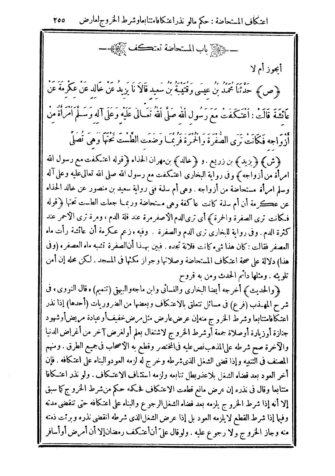(ص) حَدَّثَنَا مُحَمَّدُ بْنُ عِيسَى وَقُتَيْبَةُ بْنُ سَعِيدٍ قَالاَ نَا يَزِيدُ عَنْ خَالِدٍ عَنْ عِكْرِمَةَ عَنْ عَائِشَةَ قَالَتِ: اعْتَكَفَتْ مَعَ رَسُولِ اللَّهِ صَلَّى اللَّهُ تَعَالَى عَلَيْهِ وَعَلَى آلِهِ وَسَلَّمَ امْرَأَةٌ مِنْ أَزْوَاجِهِ فَكَانَتْ تَرَى الصُّفْرَةَ وَالْحُمْرَةَ فَرُبَّمَا وَضَعْتِ الطَّسْتَ تَحْتَهَا وَهِىَ تُصَلِّى.