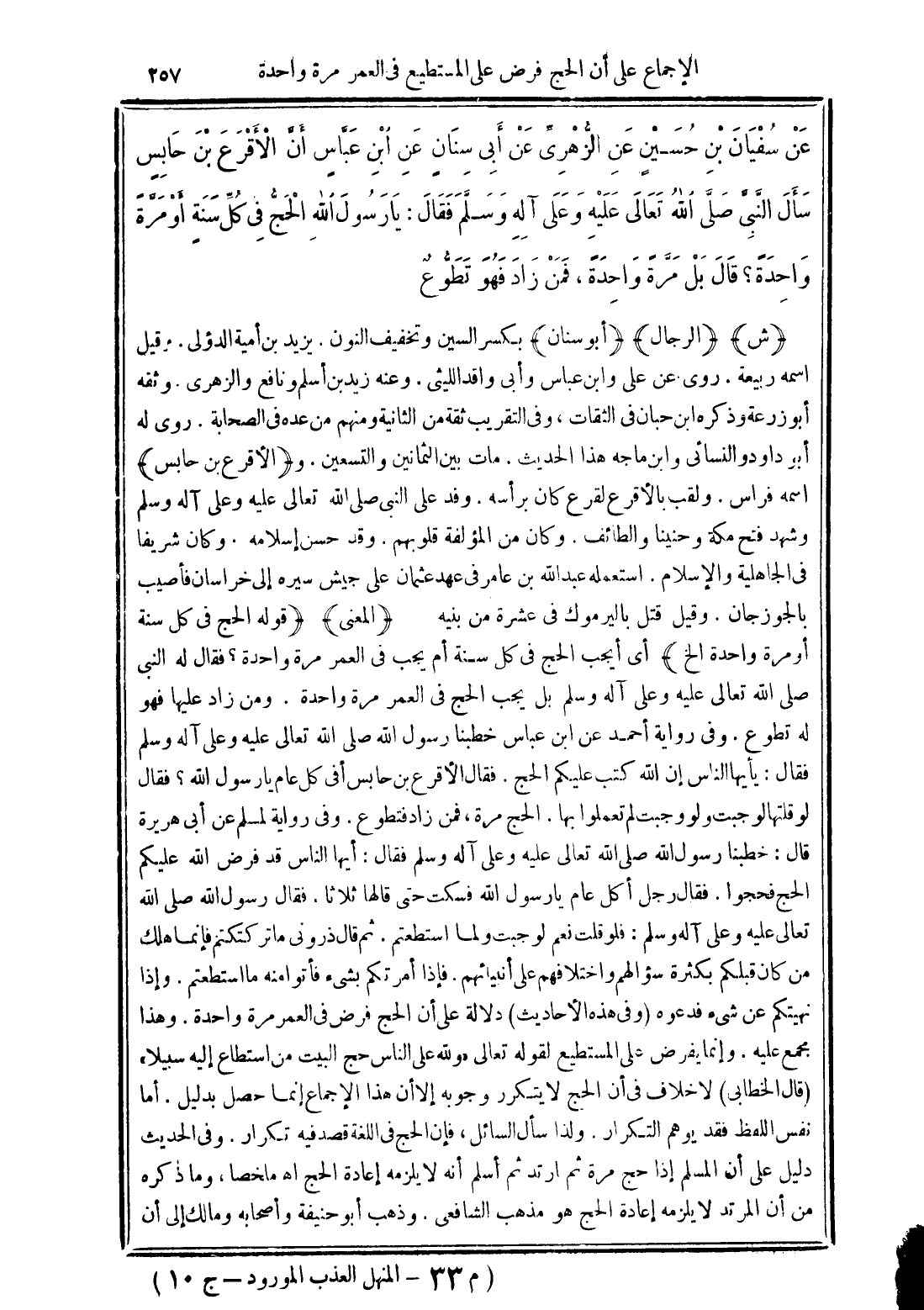 (قوله الحج في كل سنة أو مرة واحدة الخ) أي أيجب الحج في كل سنة أم يجب في العمر مرة واحدة؟ ومن زاد عليها فهو له تطوع. وفي رواية أحمد عن ابن عباس خطبنا رسول الله صلى الله تعالى عليه وعلى آله وسلم فقال: يأيها الناس إن الله كتب عليكم الحج. فقال الأقرع بن حابس أفي كل عام يا رسول الله؟ فقال لو قلتها لوجبت ولو وجبت لم تعملوا بها. الحج مرة فمن زاد فتطوع. وفي رواية لمسلم عن أبي هريرة قال: خطبنا رسول الله صلى الله تعالى عليه وعلى آله وسلم فقال: أيها الناس قد فرض الله عليكم الحج فحجوا. فقال رجل أكل عام يا رسول الله فسكت حتى قالها ثلاثا. فقال رسول الله صلى الله تعالى عليه وعلى آله وسلم: فلو قلت نعم لوجبت ولما استطعتم. ثم قال ذروني ما تركتكم فإنما هلك من كان قبلكم بكثرة سؤالهم واختلافهم على أنبيائهم. فإذا أمرتكم بشيء فأتوا منه ما استطعتم. وإذا نهيتكم عن شيء فدعوه (وفي هذه الأحاديث) دلالة على أن الحج فرض في العمر مرة واحدة. وهذا مجمع عليه. وإنما يفرض على المستطيع لقوله تعالى {وَلِلَّهِ عَلَى النَّاسِ حِجُّ الْبَيْتِ مَنِ اسْتَطَاعَ إِلَيْهِ سَبِيلًا} (قال الخطابي) لا خلاف في أن الحج لا يتكرر وجوبه إلا أن هذا الإجماع إنما حصل بدليل. أما نفس اللفظ فقد يوهم التكرار. ولذا سأل السائل, فإن الحج في اللغة قصد فيه تكرار. وفي الحديث دليل على أن المسلم إذا حج مرة ثم ارتد ثم أنه لا يلزمه إعادة الحج اهـ ملخصا, وما ذكره من أن المرتد لا يلزمه إعادة الحج هو مذهب الشافعي. وذهب أبو حنيفة وأصحابه ومالك إلى أن