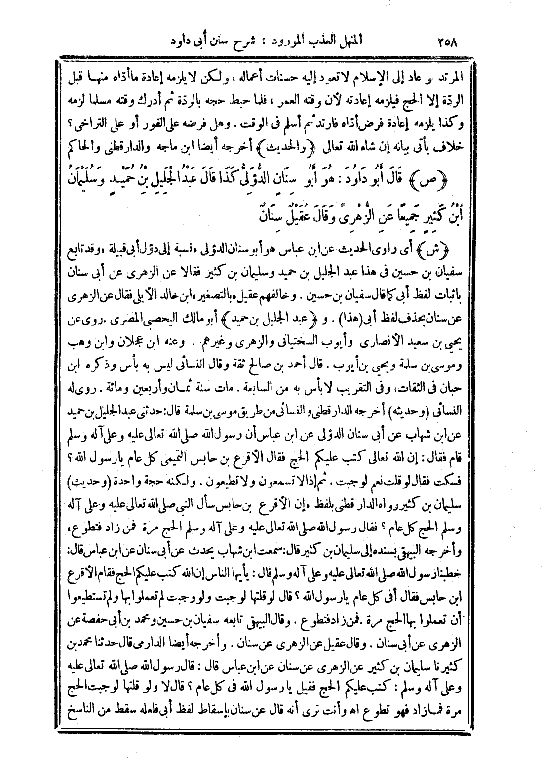 (ش) أى راوى الحديث عن ابن عباس هو ابن سنان الدؤلى "نسبة إلى دؤل أبى قبيلة" وقد تابع سفيان بن حسين فى هذا عبد الجليل بن حميد وسليمان بن كثير فقالا عن الزهرى عن أبى سنان باثبات لفظ أبى كما قال سفيان بن حسين. وخالفهم عقيل "بالتصغير" ابن خالد الأيلى فقال عن الزهرى عن سنان بحذف لفظ أبى (هذا). و (عبد الجليل بن حميد) أبو مالك اليحصبى المصرى. روى عن يحيى بن سعيد الأنصارى وأيوب السختيانى والزهرى وغيرهم. وعنه ابن عجلان وابن وهب وموسى بن سلمة ويحيى بن أيوب. قال أحمد بن صالح ثقة وقال النسائى ليس به بأس وذكره ابن حبان فى الثقات، وفى التقريب لا بأس به من السابعة. مات سنة ثمان وأربعين ومائة. روى له النسائى (وحديثه) أخرجه الدارقطنى والنسائى من طريق موسى بن سلمة قال: حدثنى عبد الجليل بن حميد عن ابن شهاب عن أبى سنان الدؤلى عن ابن عباس أن رسول الله صلى الله تعالى عليه وعلى آله وسلم قام فقال: إن الله تعالى كتب عليكم الحج فقال الأقرع بن حابس التميمى كل عام يا رسول الله؟ فسكت فقال لو قلت نعم لوجبت. ثم إذا لا تسمعون ولا تطيعون. ولكنه حجة واحدة (وحديث) سليمان بن كثير رواه الدارقطنى بلفظ "إن الأقرع بن حابس سأل النبى صلى الله تعالى عليه وعلى آله وسلم الحج كل عام؟ فقال رسول الله صلى الله تعالى عليه وعلى آله وسلم الحج مرة واحدة فمن زاد فتطوع" وأخرجه البيهقى بسنده إلى سليمان بن كثير قال: سمعت ابن شهاب يحدث عن أبى سنان عن ابن عباس قال: خطبنا رسول الله صلى الله تعالى عليه وعلى آله وسلم قال: يأيها الناس إن الله كتب عليكم الحج فقام الأقرع ابن حابس فقال أفى كل عام يا رسول الله؟ قال لو قلتها لوجبت ولو وجبت لم تعملوا بها ولم تستطيعوا أن تعملوا بها الحج مرة. فمن زاد فتطوع. وقال البيهقى تابعه سفيان بن حسين ومحمد بن أبى حفصة عن الزهرى عن أبى سنان. وقال عقيل عن الزهرى عن سنان. وأخرجه أيضا الدارمى قال حدثنا محمد بن كثير نا سليمان بن كثير عن الزهرى عن سنان عن ابن عباس قال: قال رسول الله صلى الله تعالى عليه وعلى آله وسلم: كتب عليكم الحج فقيل يا رسول الله فى كل عام؟ قال لا ولو قلتها لوجبت الحج مرة فما زاد فهو تطوع اهـ وأنت ترى أنه قال عن سنان بإسقاط لفظ أبي فلعله سقط من الناسخ