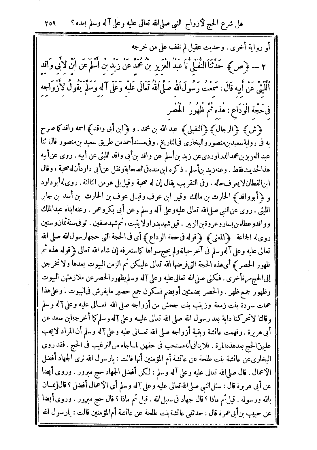(ش) (الرجال) (النفيلى) عبد الله بن محمد. و (ابن أبى واقد) اسمه واقد كما صرح به فى رواية سعيد بن منصور والبخارى فى التاريخ. وفى مسند أحمد من طريق سعيد بن منصور قال ثنا عبد العزيز بن محمد الدراوردى عن زيد بن أسلم عن واقد بن أبى واقد الليثي عن أبيه. روى عن أبيه هذا الحديث فقط. وعنه زي بن أسلم. ذكره ابن منده فى الصحابة ونقل عن أبى داود أن له صحبة، وقال ابن القطان لا يعرف حاله، وفى التقريب يقال إن له صحبة وقيل بل هو من الثالثة. روى له أبو داود و (أبو واقد) الحارث بن مالك وقيل ابن عوف وقيل عوف بن الحارث بن أسد بن جابر الليثى. روى عن النبى صلى الله تعالى عليه وعلى آله وسلم وعن أبى بكر وعمر. وعنه ابناه عبد الملك وواقد وعطاء بن يسار وعروة بن الزبير. قيل شهد بدرا ولا يثبت، ثم شهد صفين. توفى سنة ثمان وستين روى له الجماعة (المعنى)