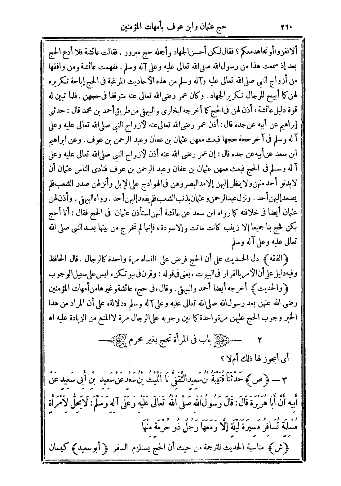 ألا نغزوا أو نجاهد معكم؟ فقال لكن أحسن الجهاد وأجمله حج مبرور. فقالت عائشة فلا أدع الحج بعد إذ سمعت هذا من رسول الله صلى الله تعالى عليه وعلى آله وسلم. ففهمت عائشة ومن وافقها من أزواج النبى صلى الله تعالى عليه وعلى آله وسلم من هذه الأحاديث المرغبة فى الحج إباحة تكريره لهن كما أبيح للرجال تكرير الجهاد. وكان عمر رضى الله تعالى عنه متوقفا فى حجهن. فلما تبين له قوة دليل عائشة، أذن لهن فى الحج كما أخرجه البخارى والبيهقى من طريق أحمد بن محمد قال: حدثنى إبراهيم عن أبيه عن جده قال: أذن عمر رضى الله تعالى عنه لأزواج النبى صلى الله تعالى عليه وعلى آله وسلم فى آخر حجة حجها فبعث معهن عثمان بن عفان وعبد الرحمن بن عوف. وعن إبراهيم ابن سعد عن أبيه عن جده قال: إن عمر رضى الله عنه أذن لأزواج النبى صلى الله تعالى عليه وعلى آله وسلم فى الحج فبعث معهن عثمان بن عفان وعبد الرحمن بن عوف فنادى الناس عثمان أن لا يدنو أحد منهن ولا ينظر إليهن إلا مد البصر وهن فى الهوادج على الإبل وأنزلهن صدر الشعب فلم يصعد إليهن أحد. ونزل عبد الرحمن وعثمان بذنب الشعب فلم يقعد إليهن أحد. رواه البيهقى. وأذن لهن عثمان أيضا فى خلافته كما رواه ابن سعد عن عائشة أنهن استأذن عثمان فى الحج فقال: أنا أحج بكن فحج بنا جميعا إلا زينب كانت ماتت وإلا سودة، فإنها لم تخرج من بيتها بعد النبى صلى الله تعالى عليه وعلى آله وسلم